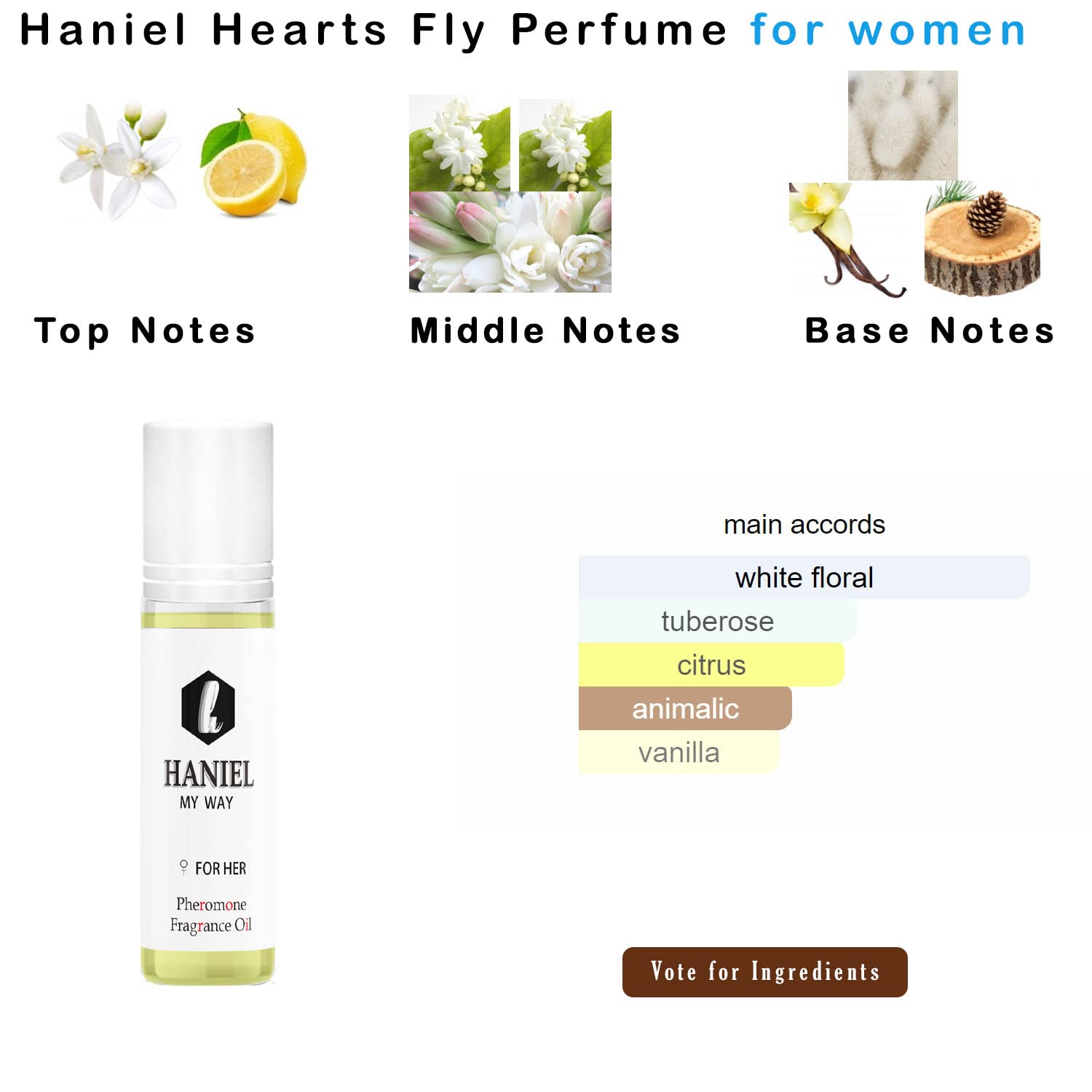 An elegant scent of haniel, Top note: Bergamot, Orange Blossom.