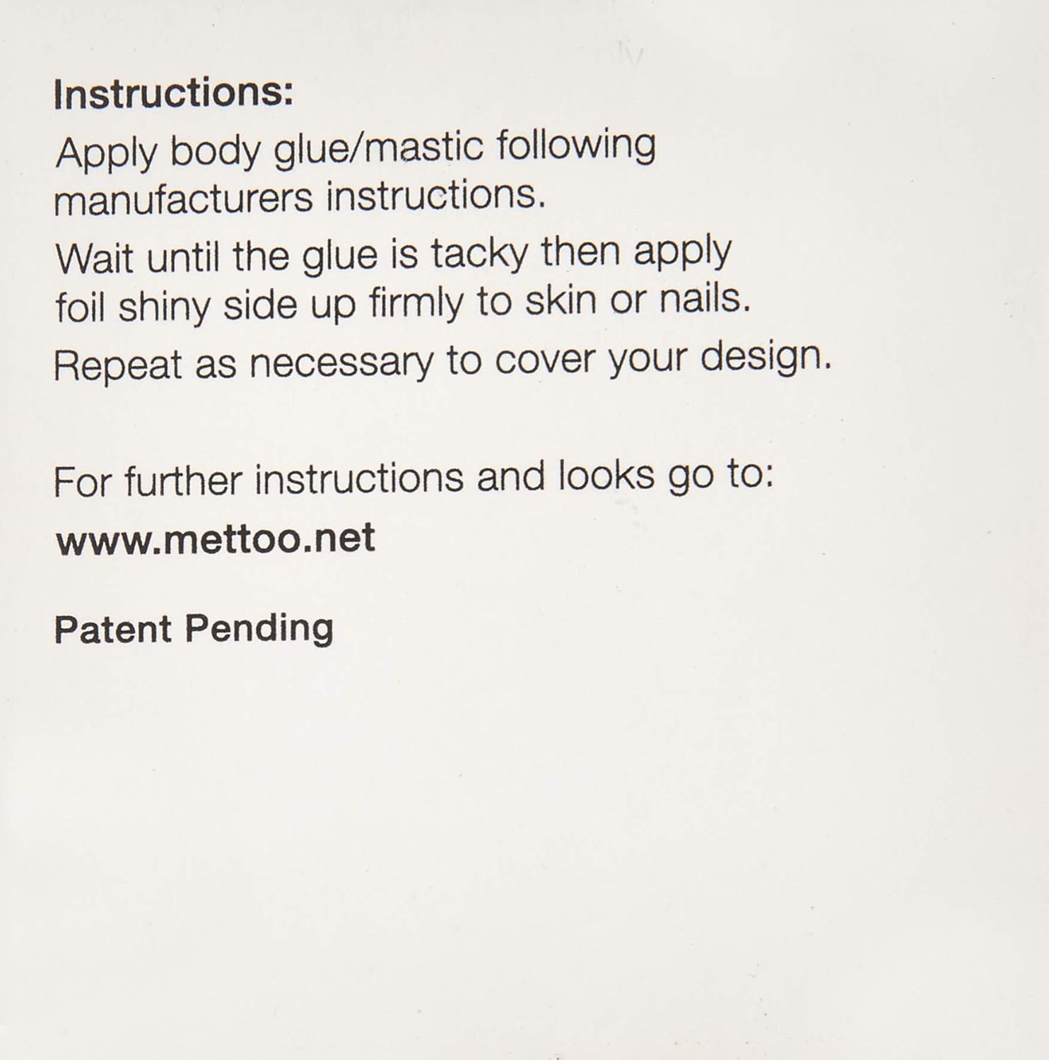 Draw your design using freehand or stencils with a brush, or use craft stamps to apply the glue for specific shapes, use the manufacturers instructions for when the glue goes tacky and then dab the foil and watch the magic as the foil transfers to your skin.
