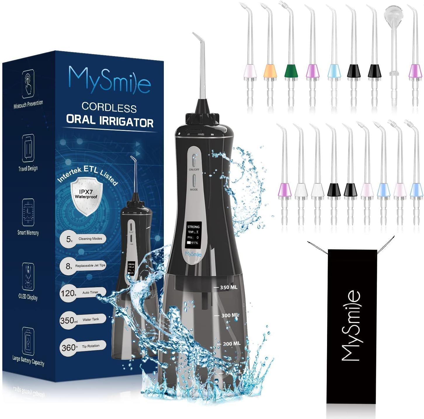Powerful Cordless Water Dental Flosser Portable Oral Irrigator with OLED Display 5 Modes 18 Replaceable Jet Tips and 350 ML Detachable Water Tank for Home Travel Use Black