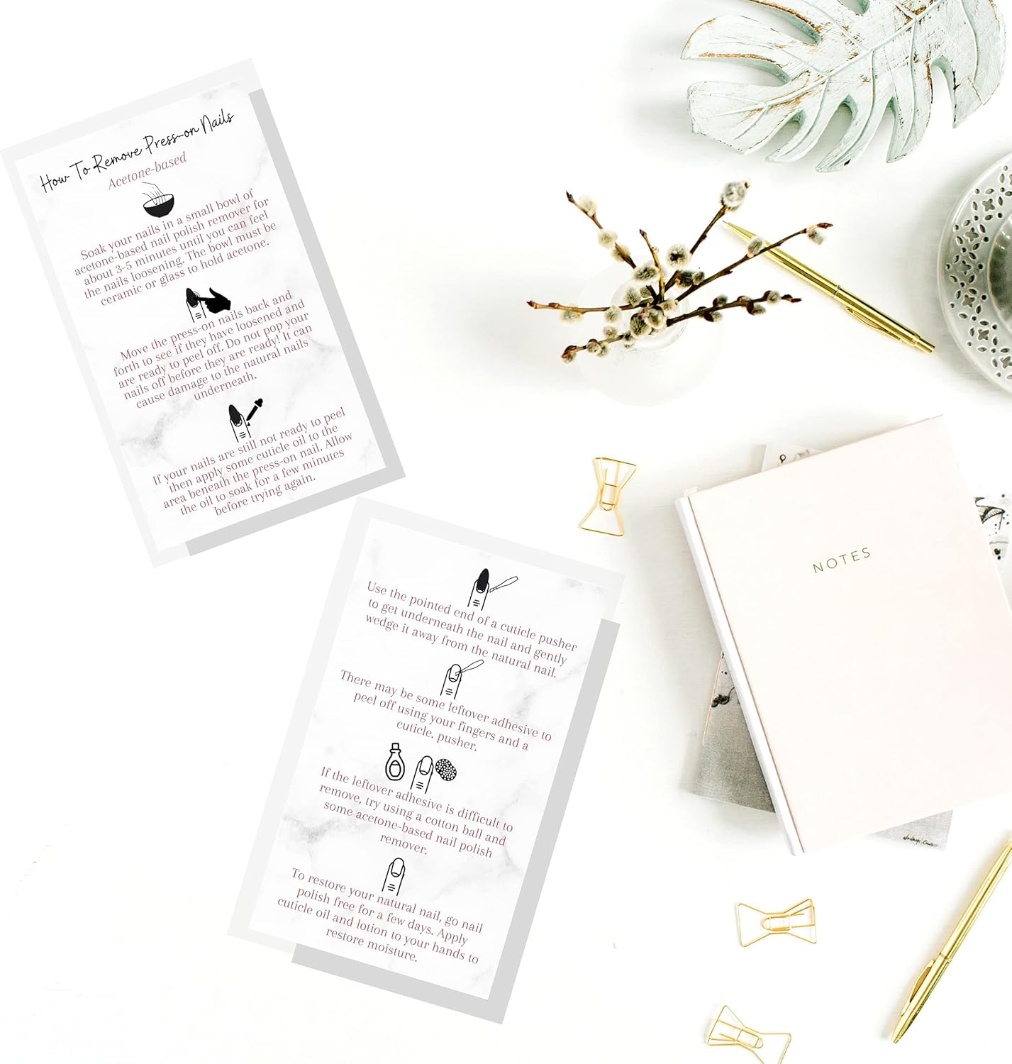 WHO ARE THESE FOR? These press-on nail removal instruction cards are ideal for nail artist offering customer”s DIY press-on nail kits.