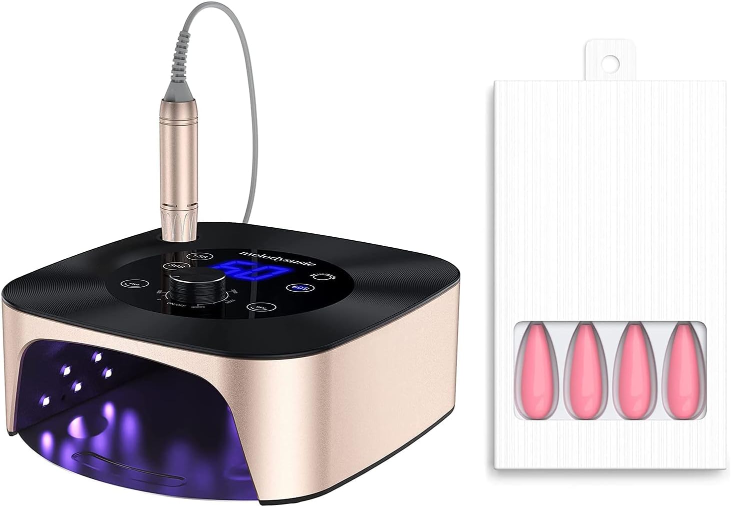 Professional 2 in 1 Nail Drill with Nail Lamp, 60W Nail Dryer with 4 Timer Setting Sensor and 24 Pcs Solid Color Press on Nails, Glossy Long Polish-Free Fake Nails Kit