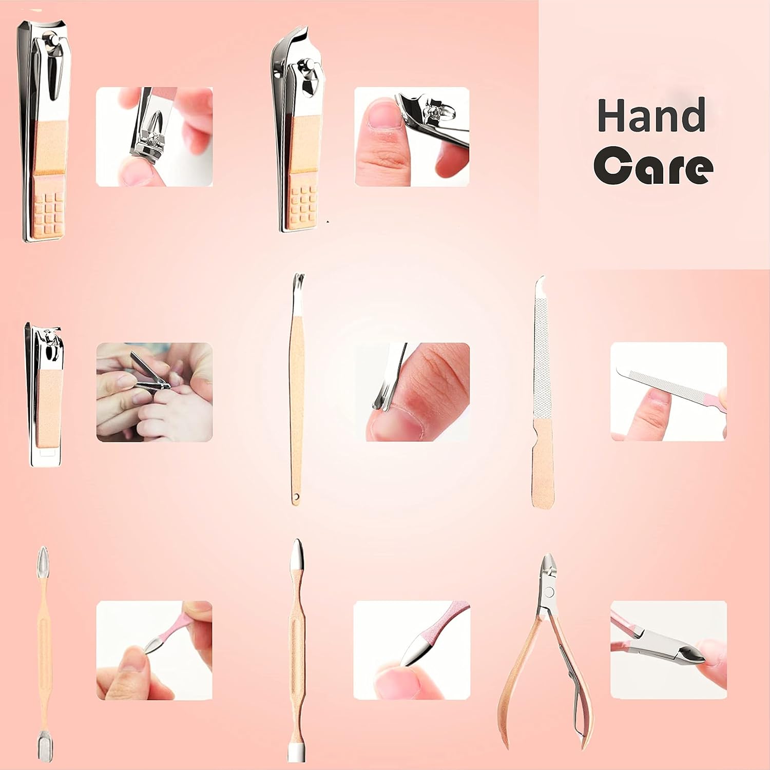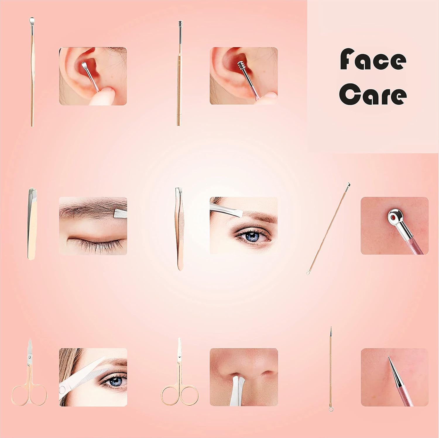 26 Tools & Extras include in this case:Face Care:1 x Eyebrow Scissor1 x Eyebrow Clips1 x Double-ended Acne Needles2 x Earpick1 x Spring Ear Spoon1 x Spiral Ear Spoon1 x Nose Hair Clippers1 x Hook Acne Needles2 x Acne Needles Hand Care:1 x Large Nail Clipper1 x Middle Nail Clipper1 x Mini Nail Clipper1 x Diagonal Nail Clipper1 x Nail Edge Trimming Tool1 x Large Nail Cleaner1 x Mini Nail Cleaner1 x large Nail File Foot Care:1 x Ingrown Toenail Clippers1 x Nail File1 x Foot Nail Cleaner1 x Right Angle Removal Tool1 x Bevel Removal Tool1 x Nail Edge Extractor1 x Scraper EXTRA GIFT:1 x Sponge Nail File1 x Eyebrow Razor1 x Eyebrow Brush