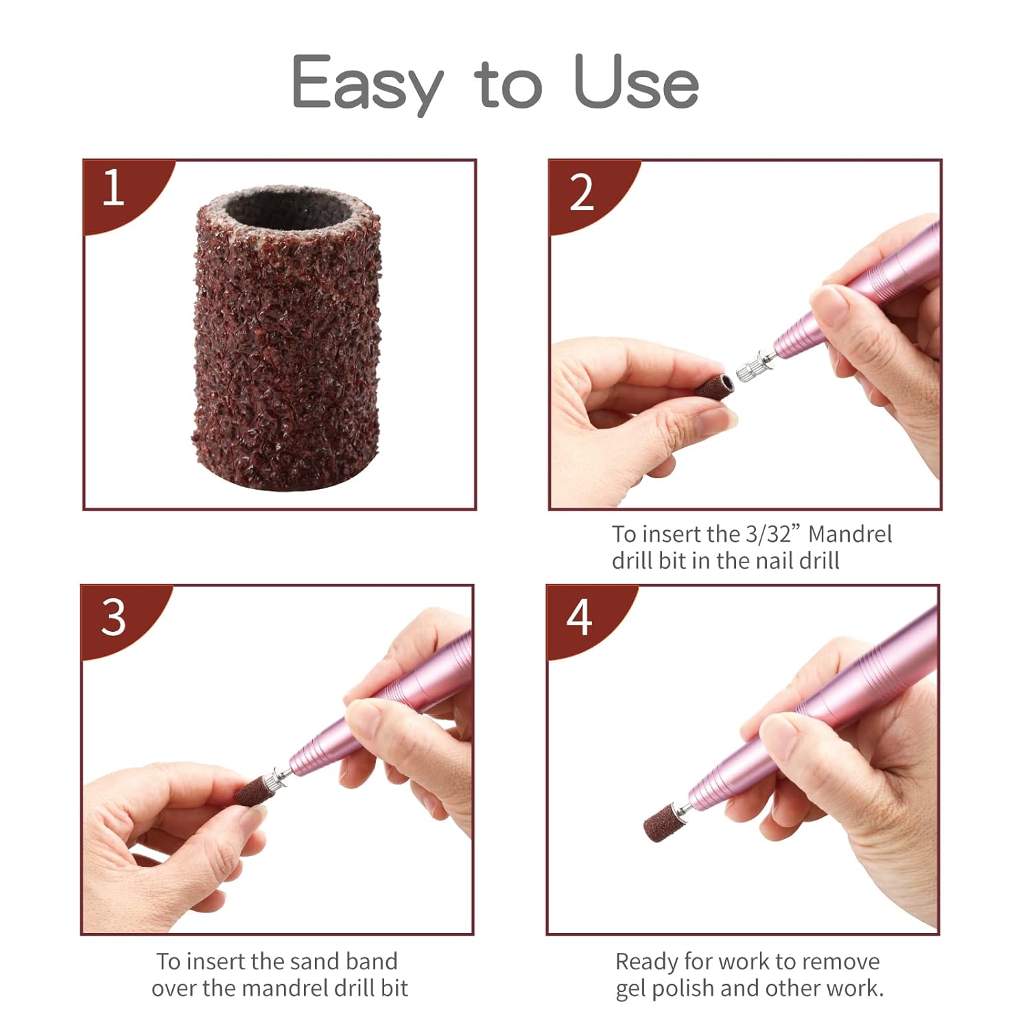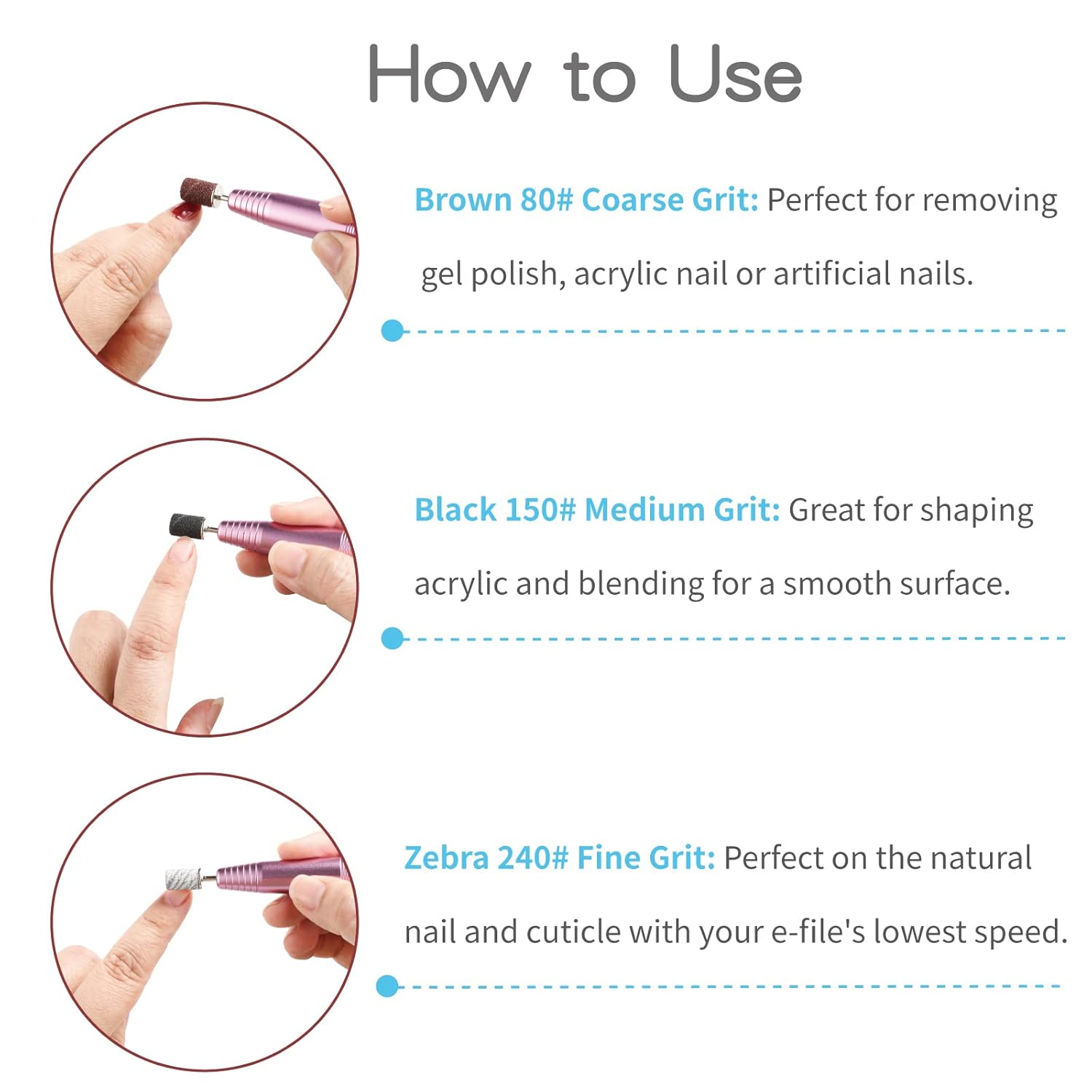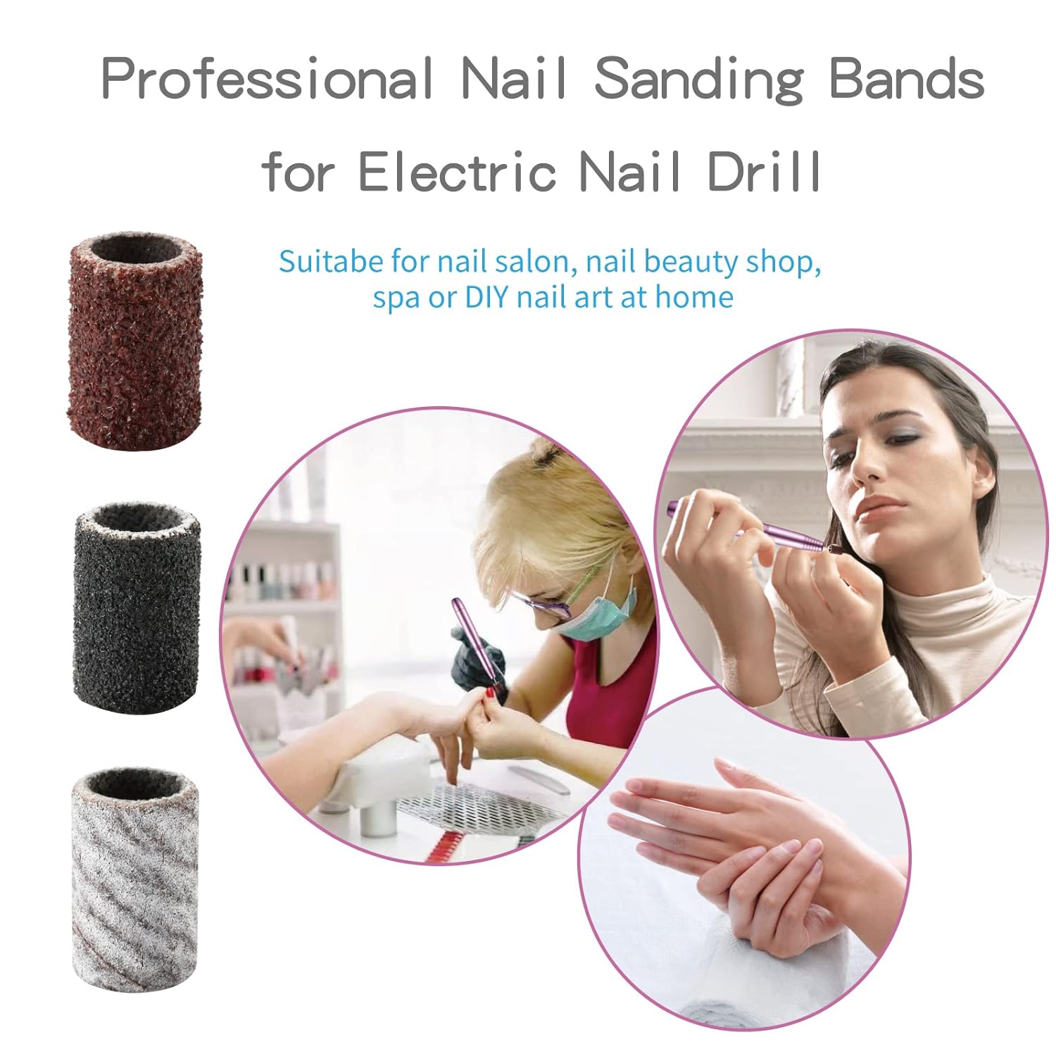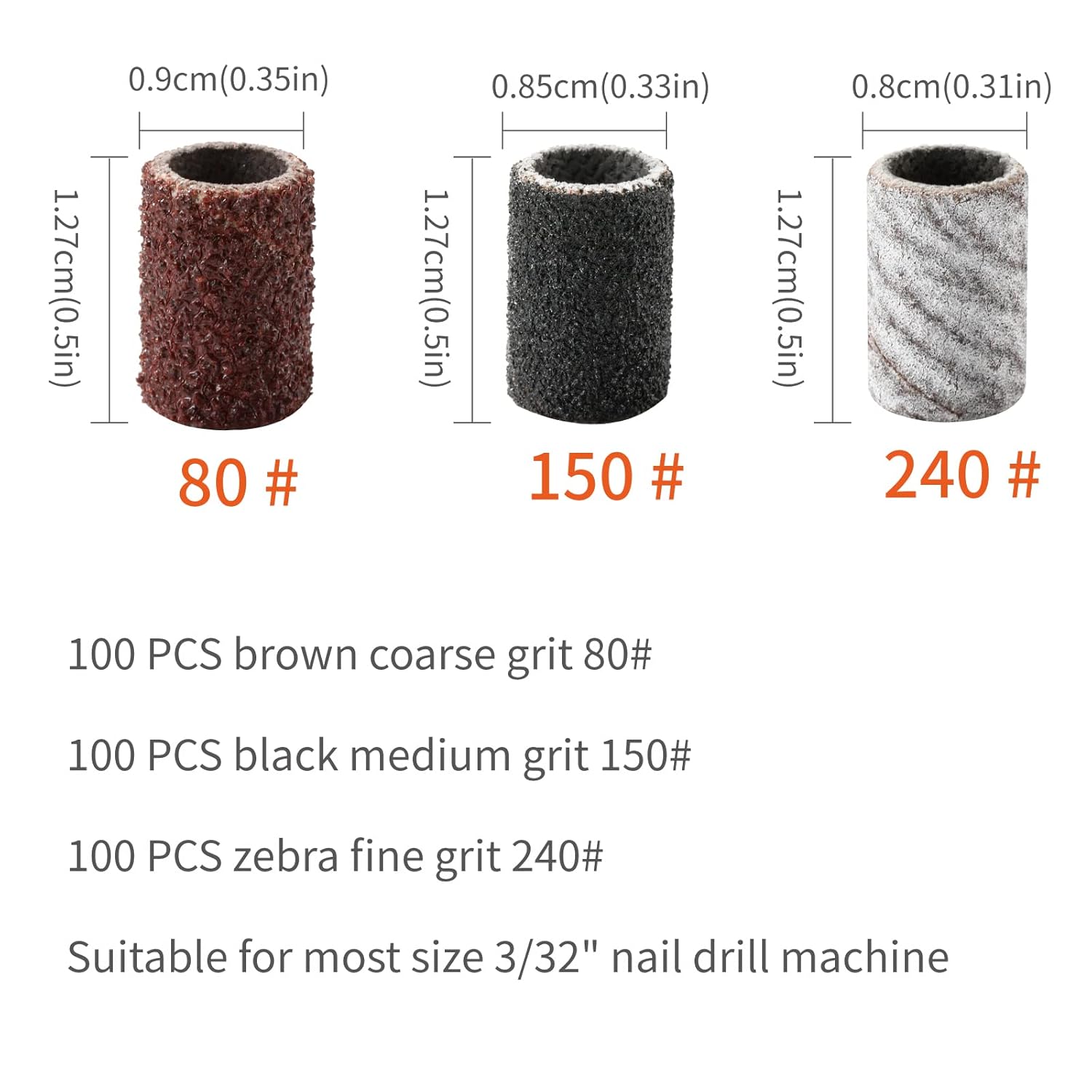 Product Description : These nail drill bits sanding bands are made of durable premium material and will not fall apart during use. Package include 300pcs Sanding Bands and 1 Mandrel: 100pcs Brown Coarse Grit 80#, 100pcs Black Medium Grit 150#, 100pcs Zebra Fine Grit 240# and 1 Mandrel, suitable for most size 3/32″ nail drill machine. Product Details :