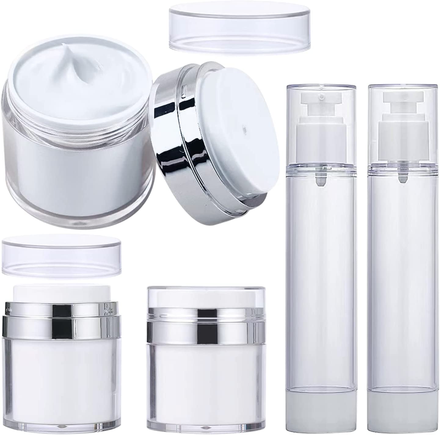 Travel Container Set: Package included 3 Pack airless pump bottles and 2 pack travel Jar for creams. Perfect choice for your favorite lotion, face creams or moisturizer for travel and daily use.