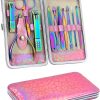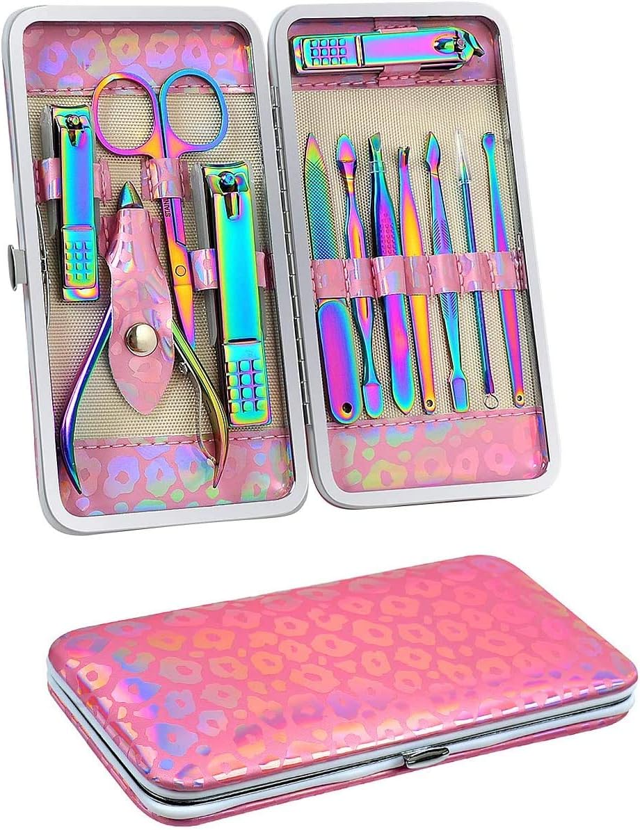 Pretty women should have a set of rainbow style nail clippers。 12 IN 1 Package including: 1x Smaller Nail Clipper for cutting the nail 1x Slanted edge Nail clipper 1x Nail File for polishing nails smooth 1x Cuticle Trimmers 1x Cuticle Knife for cleaning up the dirt inside the nails 1x Nail Clipper for toenail cutting 1x Nipper for dead skin 1x Dead skin fork for removing dead skin 1x Eyebrow Scissors for eyebrow and nose hair trimming 1x Eyebrow Tweezer for tidying eyebrow 1x Ear Pick 1x Blackhead & Acne Needle Perfect gift: The nail clippers set and grooming tools is the best gift, present & souvenir for you, your family, friends.