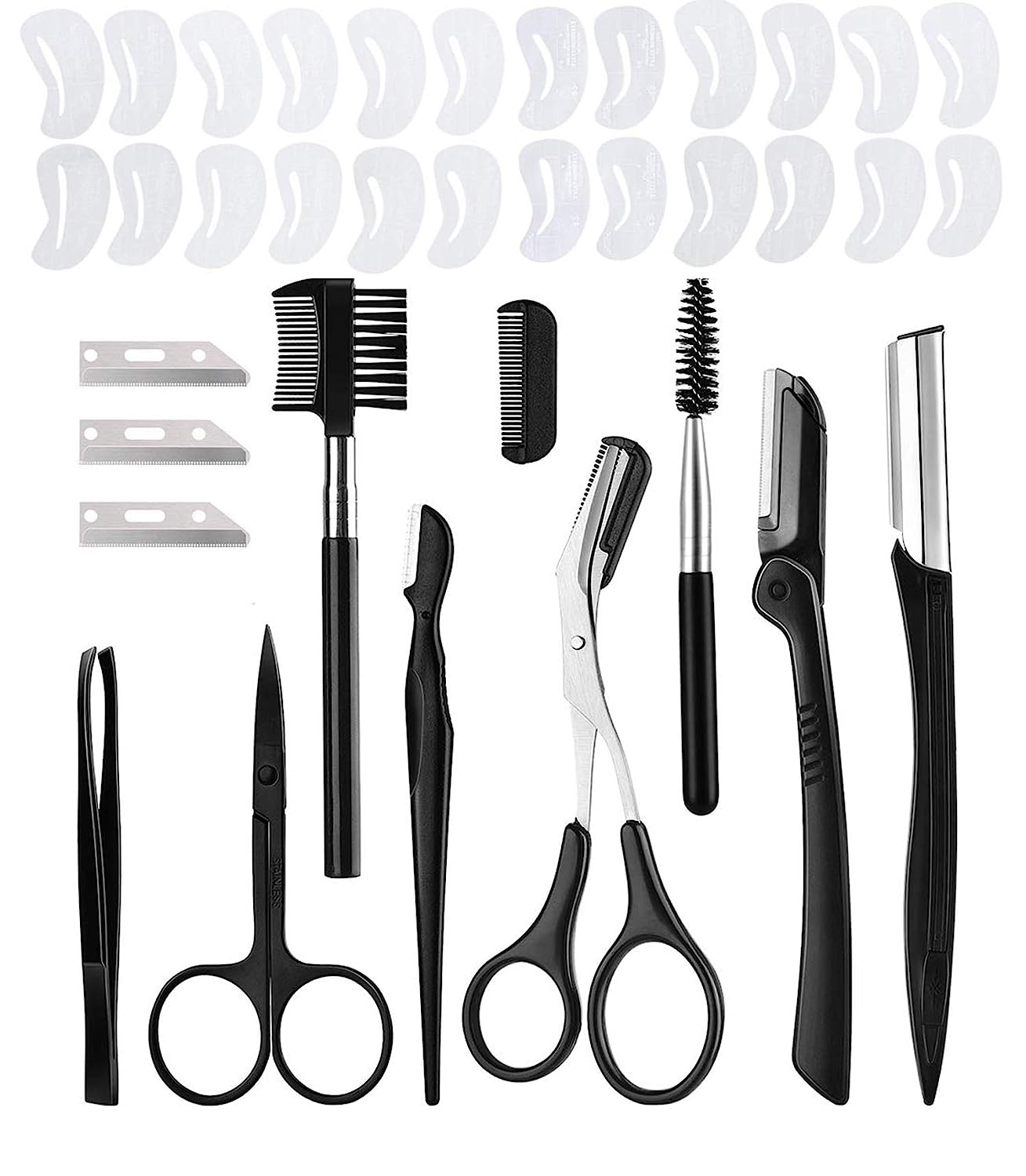 Package includes:3 x Eyebrow razor1 x Tweezers2 x Scissors2 x Eyebrow brush3 x Blade1 x Comb1 x 24pcs/set Eyebrow StencilNote:Pointed parts exist, please keep it away from little kids.