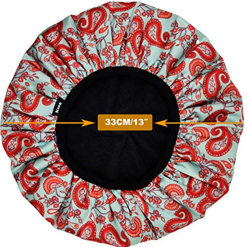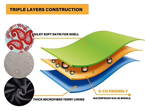 FABRICS- Triple layered with high grade SILKY SATIN material, 100% WATERPROOF PEVA material and feature an eco-friendly THICK TERRY LINING which can absorb water quickly for an added layer of protection against humidity and water to keep hair dry