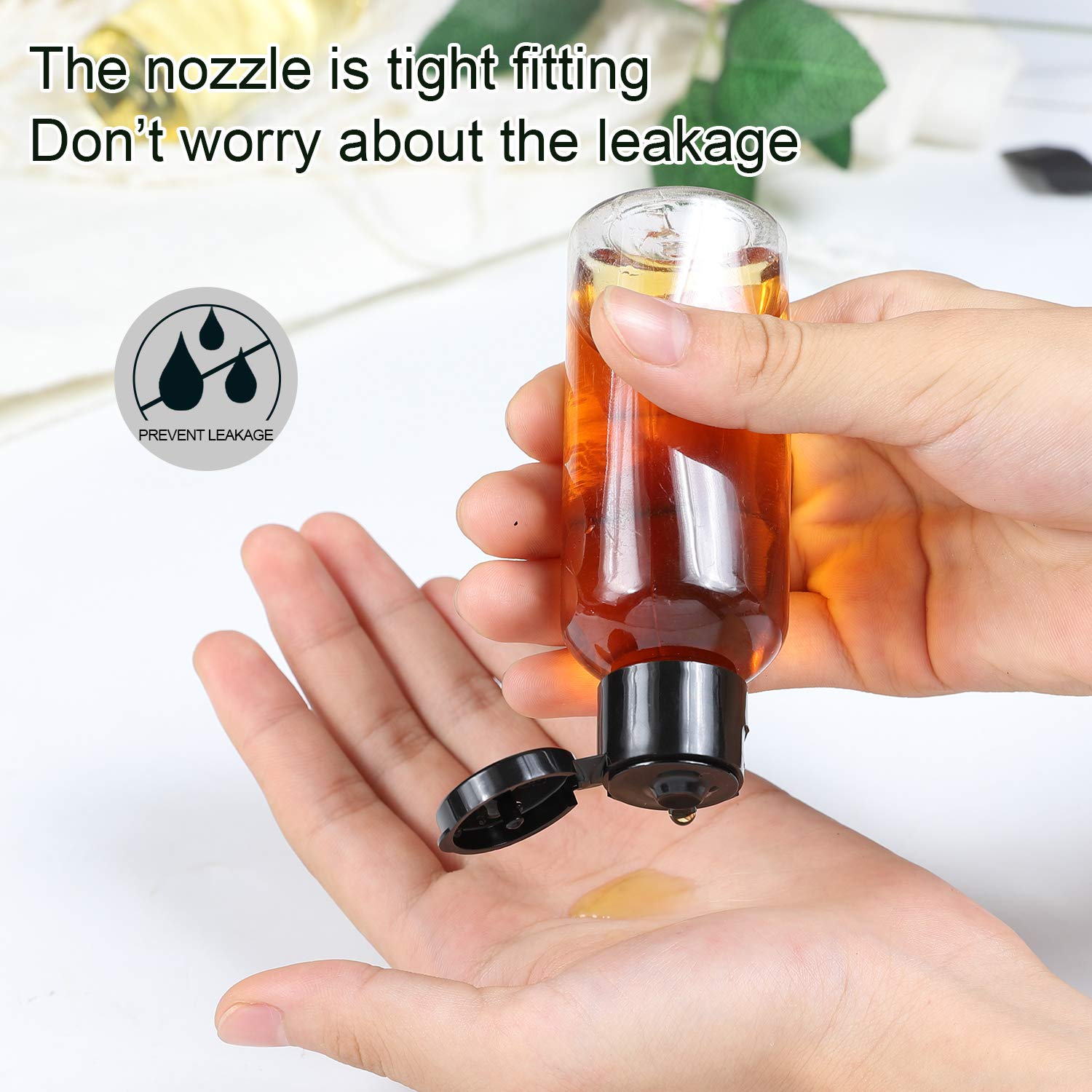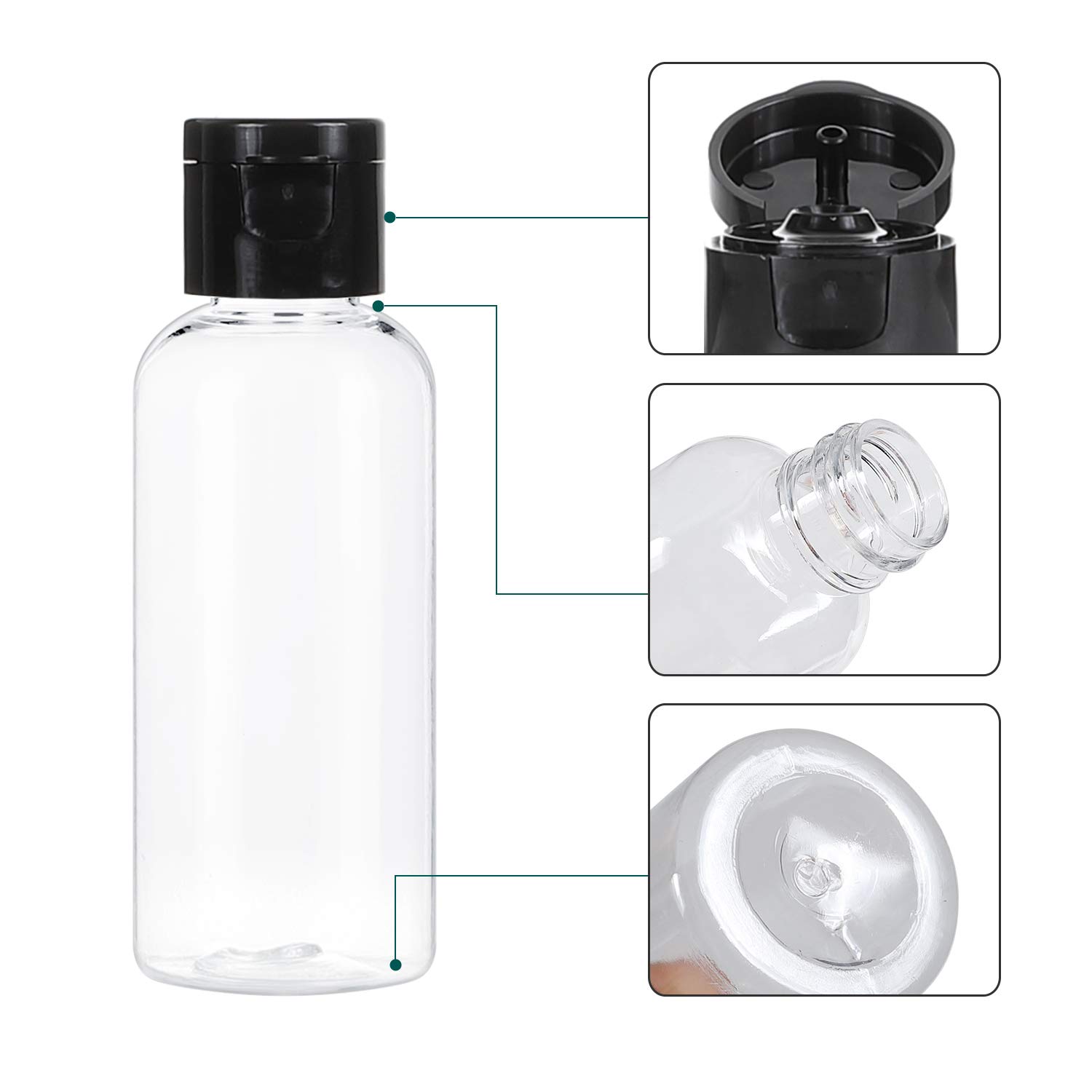 2 oz Refillable Plastic Empty Cosmetic Bottles Set with Black Flip Caps SPECIFICATIONS Quantity: 30pcs Capacity: 2 oz/60ml Weight: 150g/Set Material: PET Plastic Color: Clear + Black Bottle Height: 3.