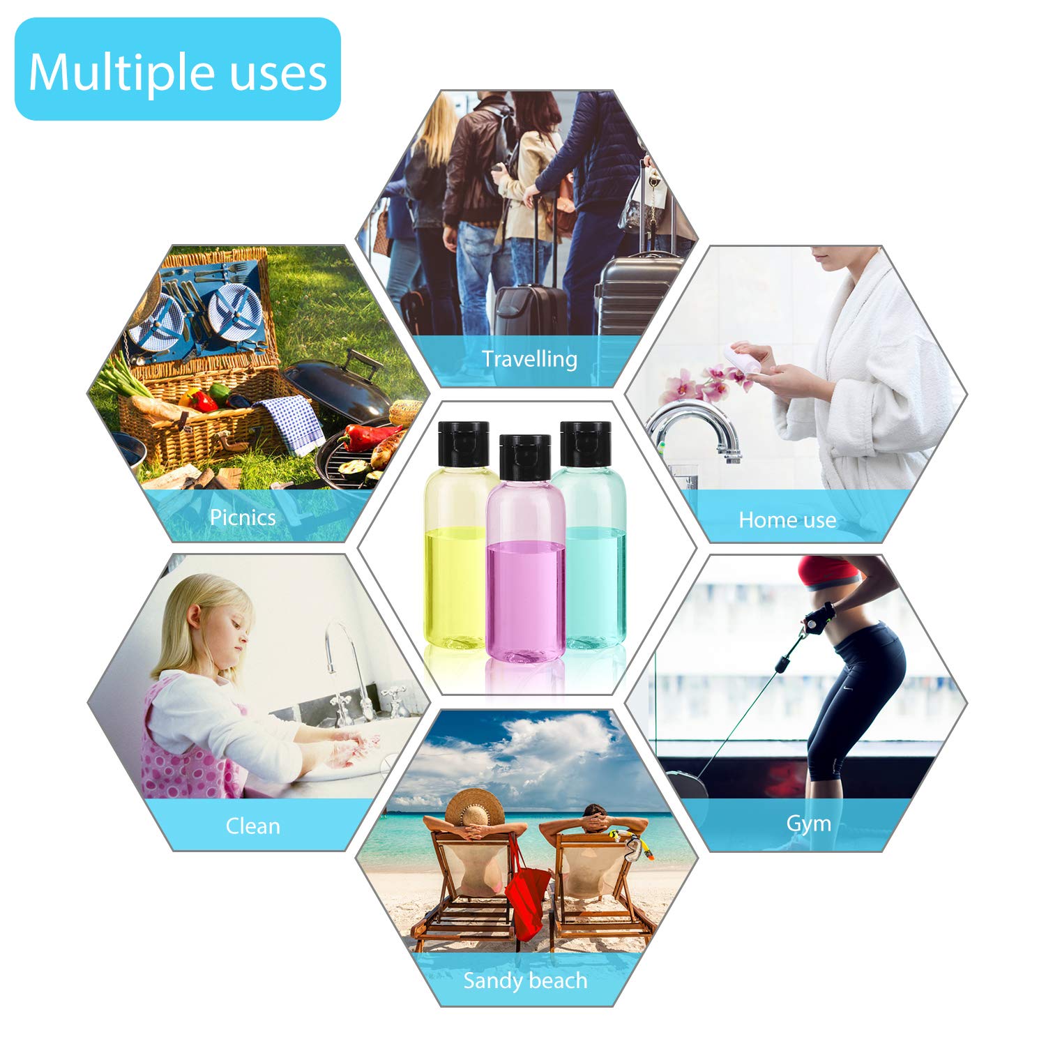 Wide Application The travel containers can be used to fill with shampoo, face toner, body wash, lotions, conditioner, or anything else, and great for traveling, business trip, camping, swimming.
