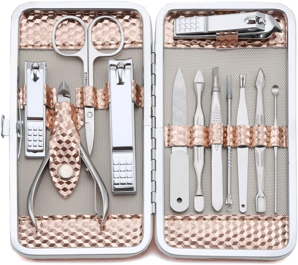 Set Professional Nail Clippers Kit Pedicure Care Tools- Stainless Steel Grooming Kit 12Pcs for Travel or Home (Rose Gold)