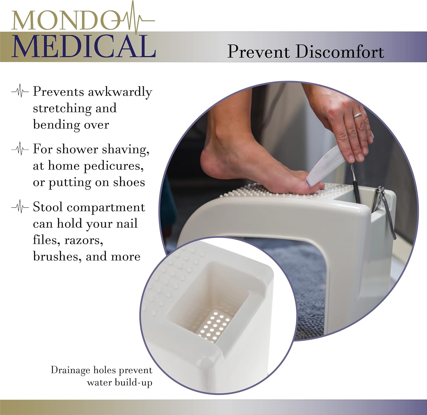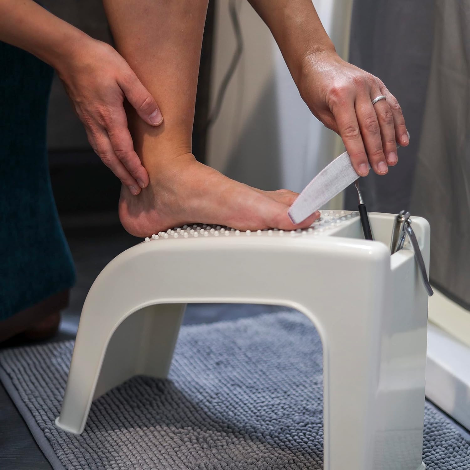 Trim and polish your toenails or shave your legs without over-reaching when you use the Shower Pedestal Shaving and Pedicure Foot Stool.
