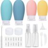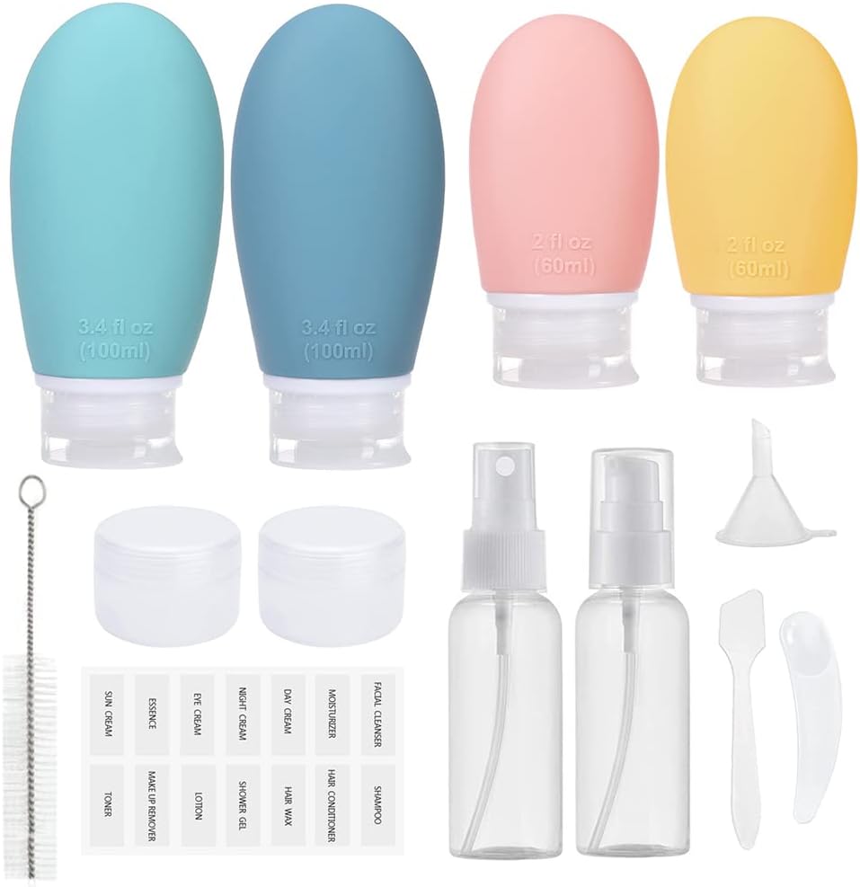 Package include: 2 x big silicone bottles 2 x small silicone bottles 2 x cream jars 1 x spray bottles 1 x pump bottles 1 x trowels 1 x funnel 1 x clean brush 1 x curved spatula 2 x tag paper What You Can Store: Cosmetic: perfect for sunblock, lotions, face wash, creams etc.