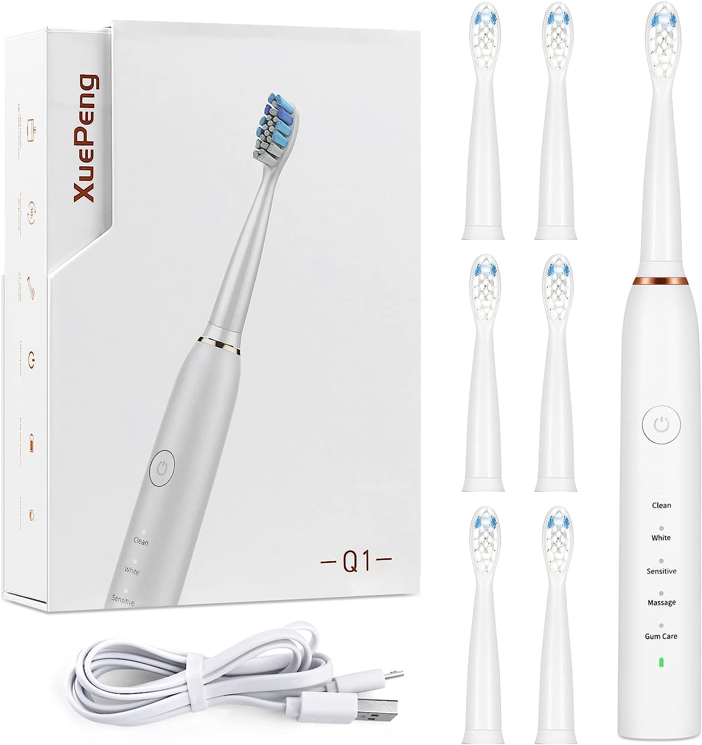 Sonic Electric Toothbrush, Electric Smart Toothbrush w/5 Modes Cleaning Whitening, Wireless Charging ToothBrushes w/6 Brush Heads for Adult, IPX7 Waterproof, Charging 2 Hours for 60 Days