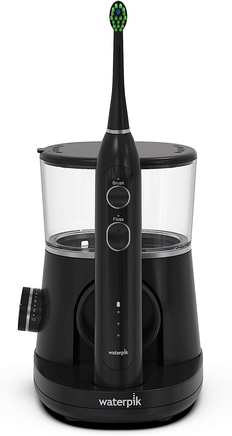 The sonic toothbrush cleans the surfaces of your teeth while the water flosser in the center of the brush head cleans between teeth and below the gumline where toothbrush bristles can”t reach.