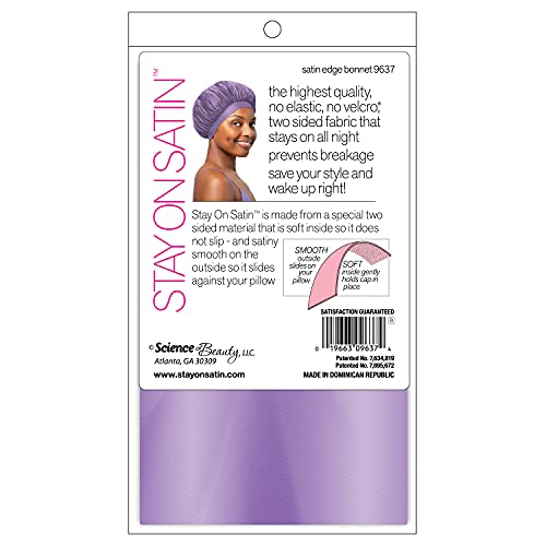 The Stay on Satin – Satin Edge Bonnet features our patented wide folded spandex satin edge band instead of elastic.