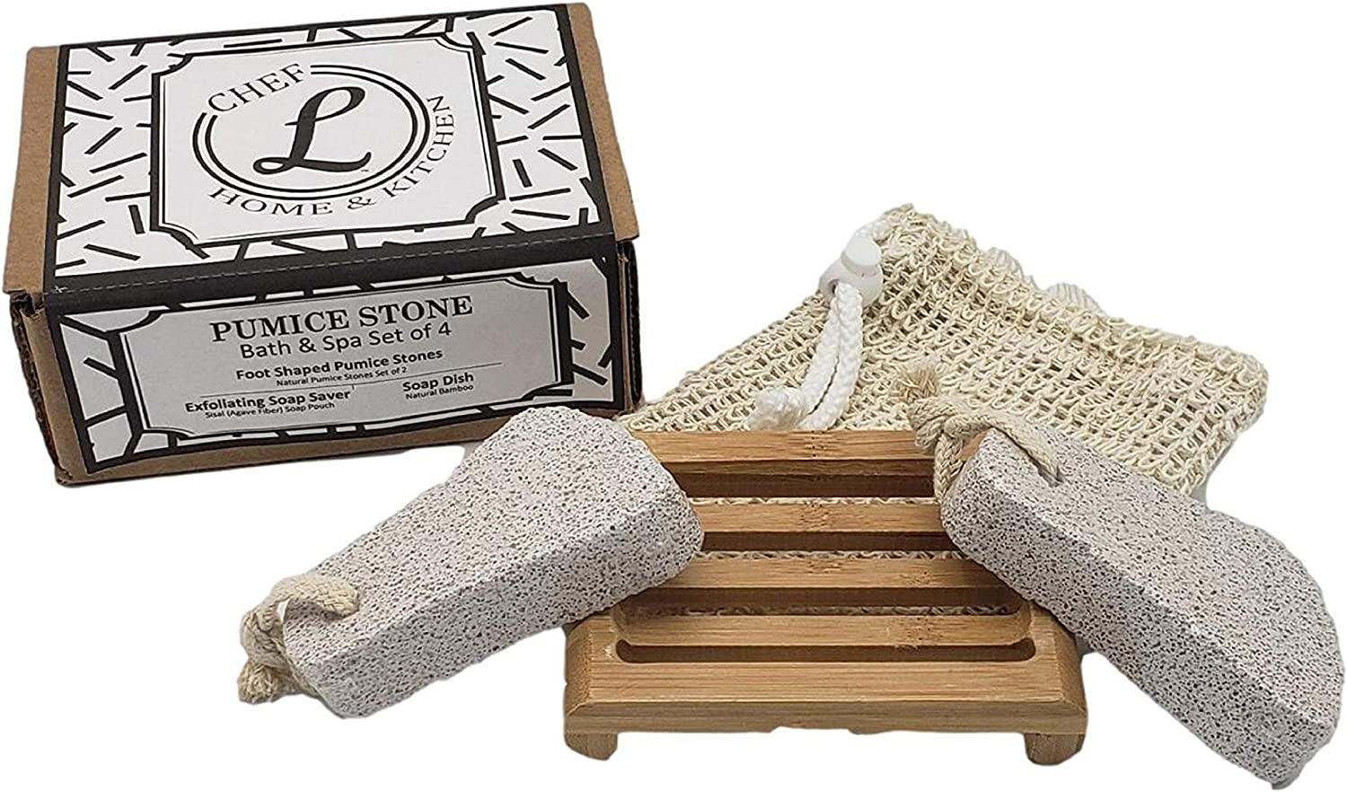 The complete set includes: 2 x pumice stones, 1 x soap dish, 1 x sisal soap bag.