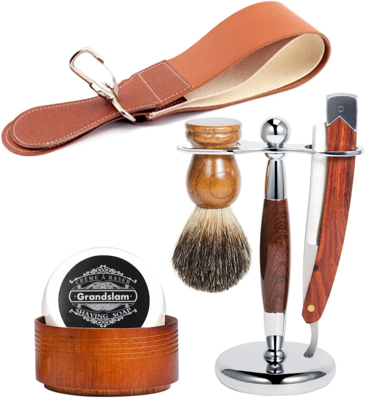 Straight Shaving Razor Badger Hair Brush Stand Holder Leather Strop Soap Bowl