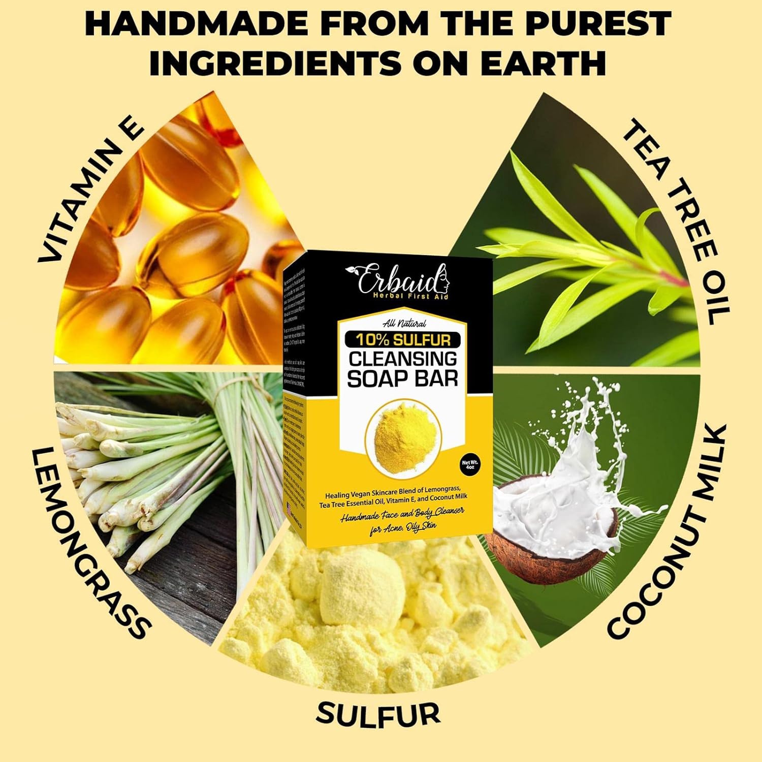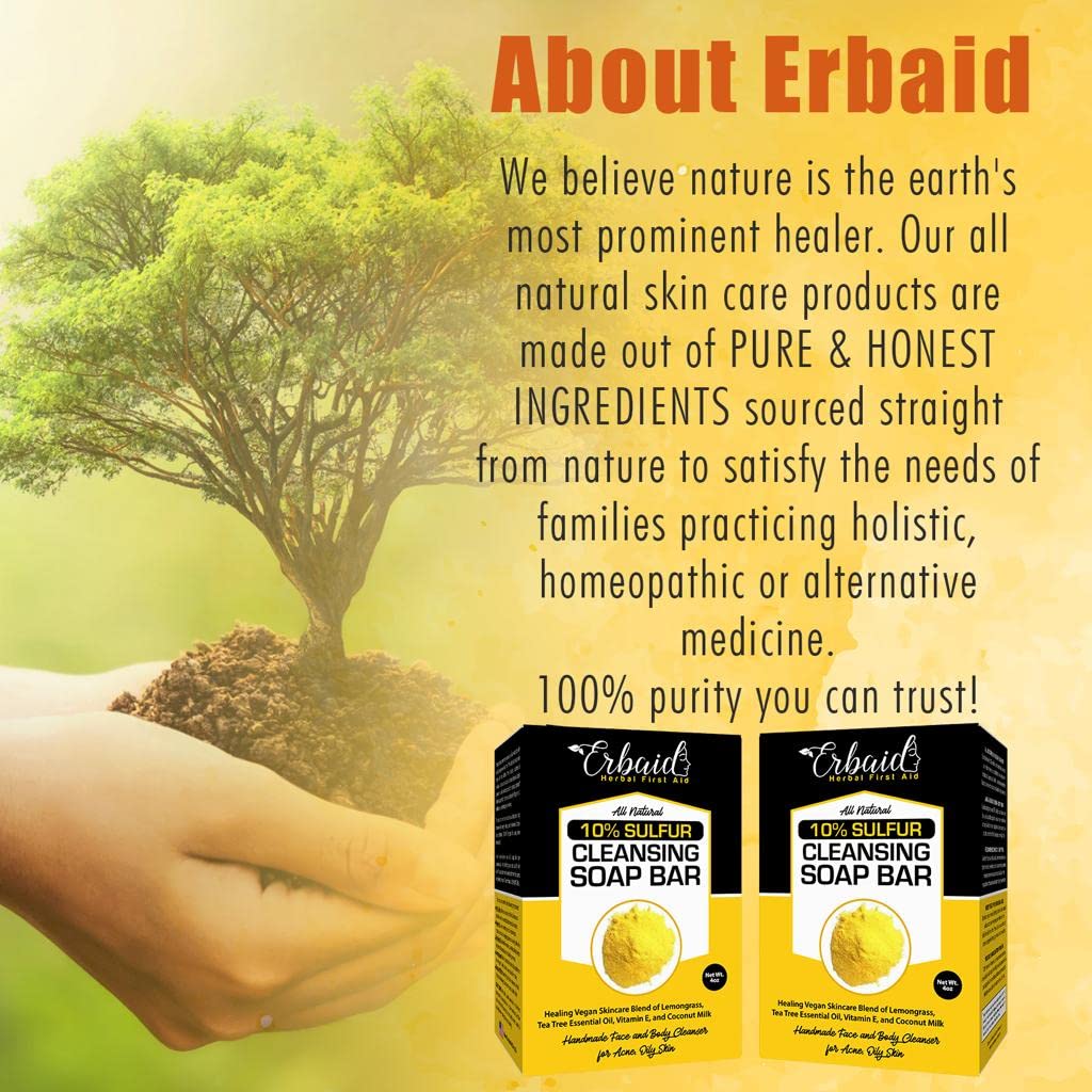 Unlike other bar soaps for acne & oily skin, this one is made entirely out of all natural oils & extracts! 10% Sulfur: dries out surface of skin & draws out dead skin cells to combat blackheads & pimples Vitamin E: non-comedogenic oil replenishes hydration without clogging pores or leaving skin oily Tea Tree Oil: natural defense properties, helps clean skin dirt, aids in healing process Lemongrass: nature”s best skin toner; also performs as astringent, helps shrink pore size & firm skin Coconut Milk: nourishing & rich in vitamins which help repair damage, fade acne scars, soften skinWe here at have taken it upon ourselves to create handcrafted bar soaps blended to commend the riches of earth.