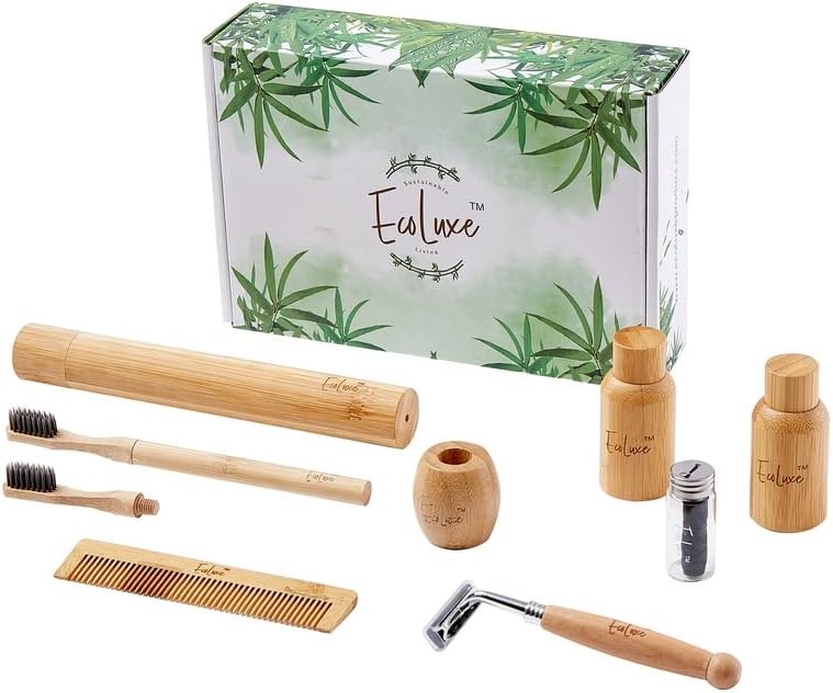 Sustainable Gift Box Personal Care Travel Sized Toiletries Bundle, Bamboo Toothbrush, Dental Floss, Comb,Liquid Containers, Razor, Bamboo Travel Case and Stand, 9 Items