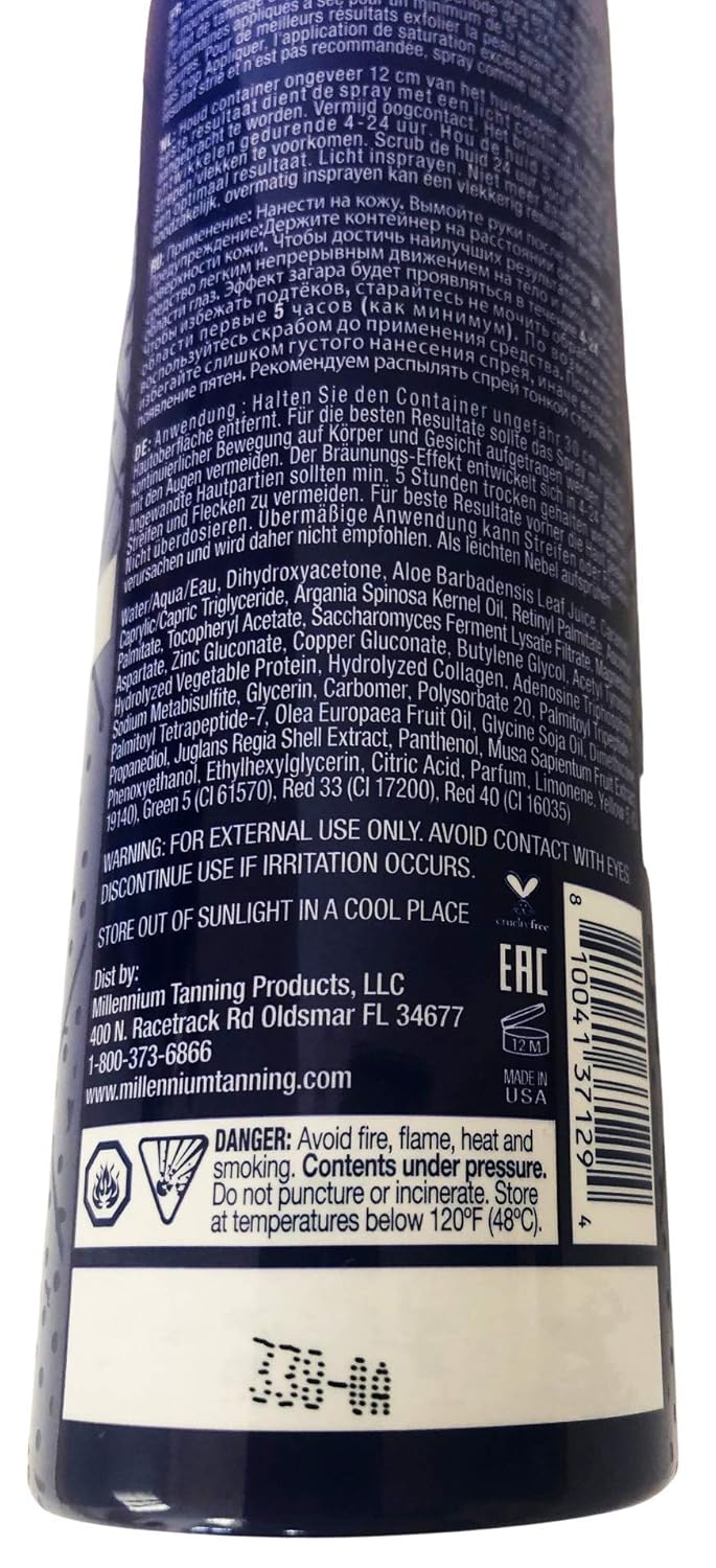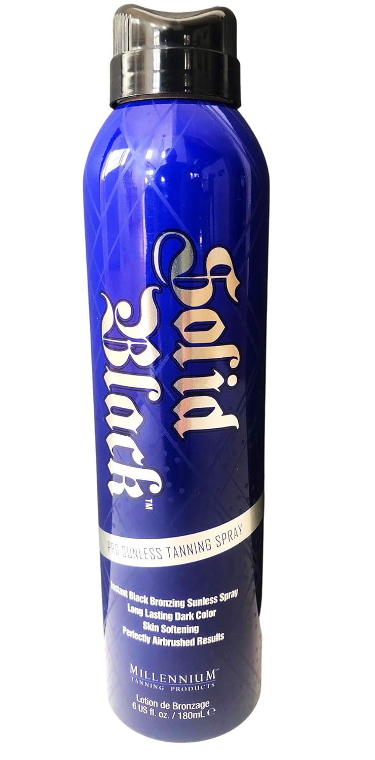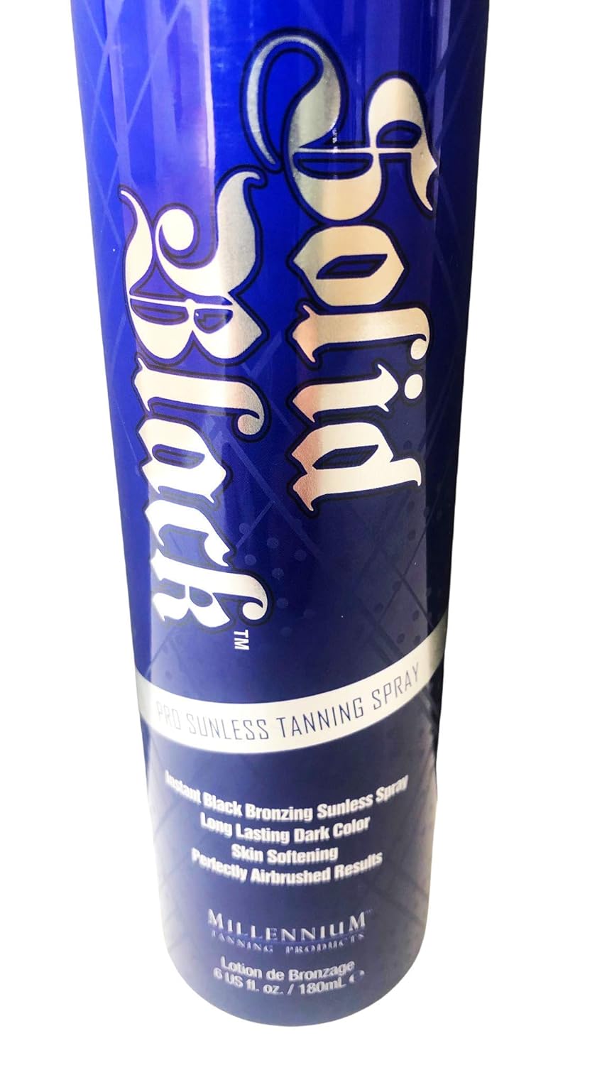 Millennium Tanning Solid Black PRO SUNLESS Self Tanning Spray Organic DHA Instant Self Tanning Bronze 7 fl oz Achieving Instant dark color is now just one spray away! With Solid Black’s Pro Sunless Spray you will receive dark immediate and dark delayed bronzing results with our unique blend of natural DHA, Walnut extracts and skin softening Argan Oils.