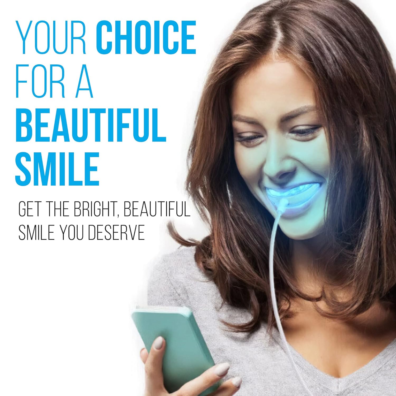 Cleanse LED mouthpiece with soap and water (make sure cord is not plugged in to phone or computer). Dry. Apply small amount of gel to upper and lower trays. Place in mouth. Plug in to iphone, android or USB. Works with any commercial whitening gel or strips — follow instructions received with your gel. If you need to spit during process, remove mouthpiece, spit, replace in mouth. Cleanse mouthpiece, dry, and store after each use.