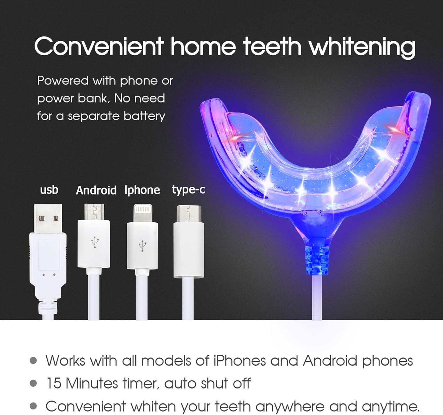 Name: IDOLUSTER Teeth Whitening Led Light Led: 16 leds Lighting: Red light(4) and Blue light(12) Tray Material: TPE Adapter: 4 adapters for iPhone,Android,USB,Type-C Function: To accelerate your teeth whitening process without sensitivity, prevent leaking gel to the mouth.
