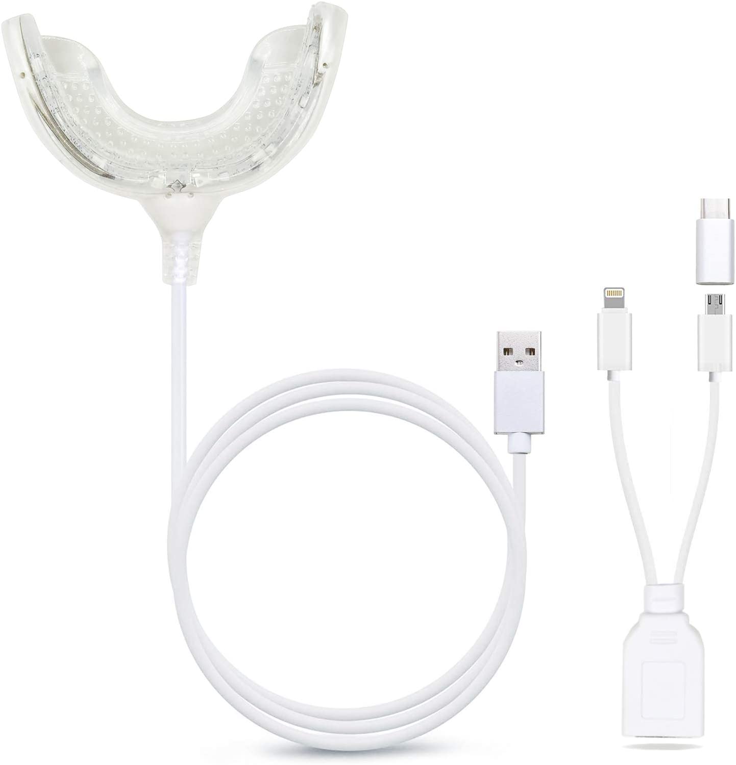 Name: IDOLUSTER Teeth Whitening Led Light Led: 16 leds Lighting: Red light(4) and Blue light(12) Tray Material: TPE Adapter: 4 adapters for iPhone,Android,USB,Type-C Function: To accelerate your teeth whitening process without sensitivity, prevent leaking gel to the mouth.