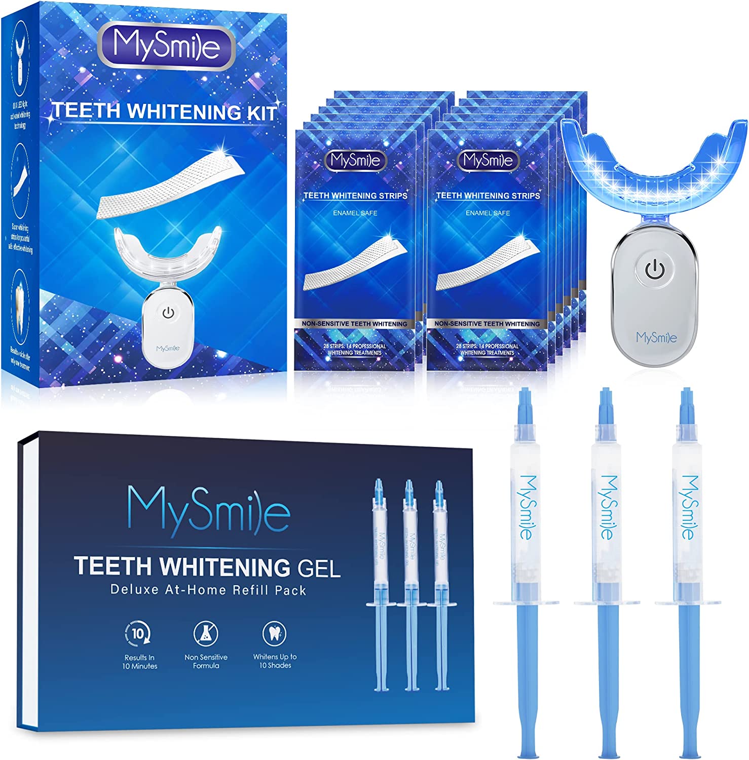 • TEETH WHITENING KIT with 28 Premium LED Lights: Our LED teeth whitening Kit comes with 1Pcs LED bulbs and 14 Sets(28 White Strips) for teeth whitening. MySmile Dentist-developed proprietary teeth whitener serum keep the same enamel-safe whitening ingredient that dentists use, Patented light will make you get 3X LONGER LASTING results without sensitivity than other brands