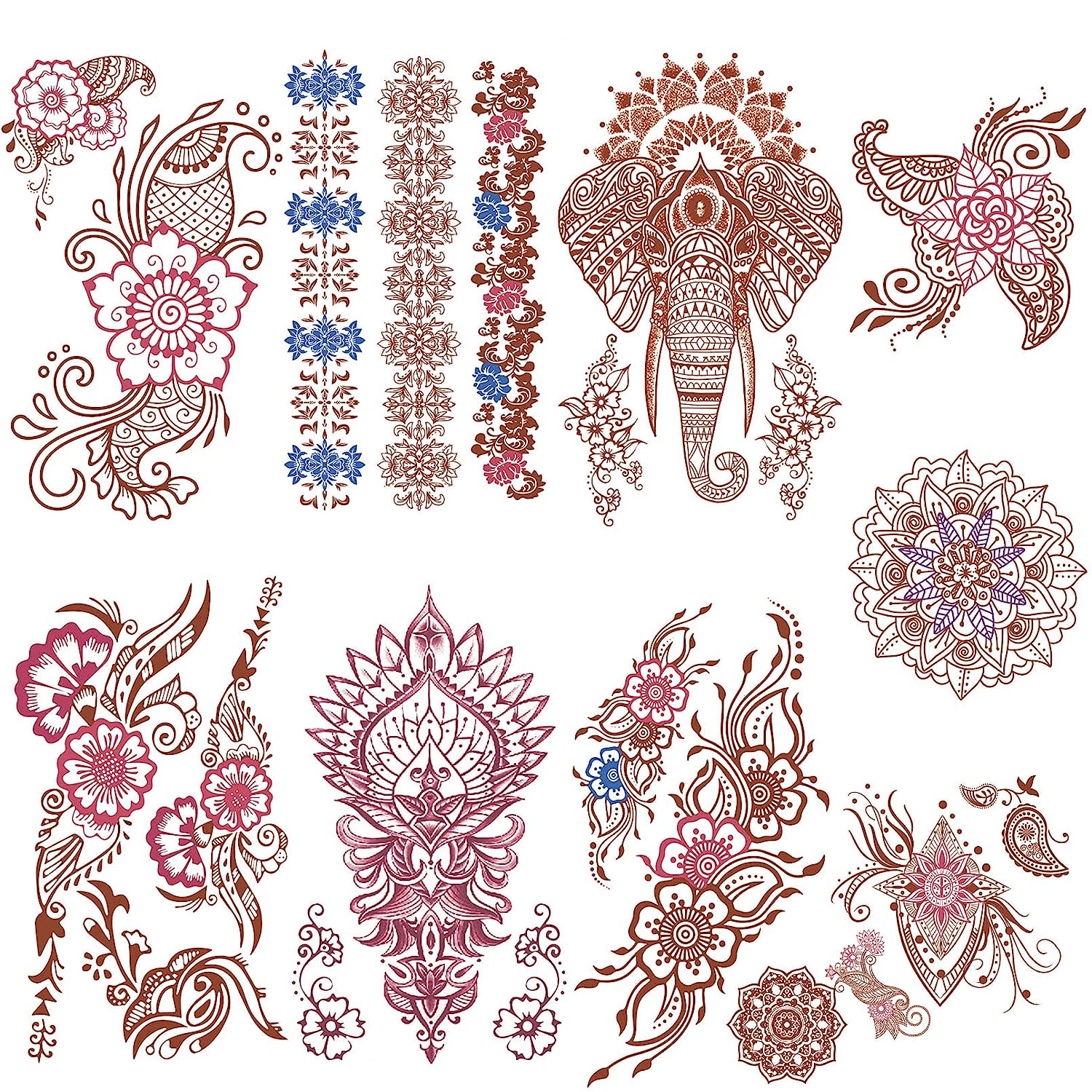 The kit includes 4 sheets of animal and flower patterns, as well as 6 sheets of henna stencils for hands and forearm.