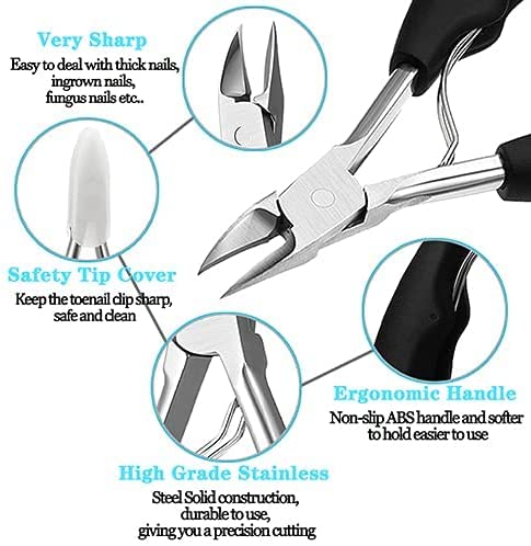 Upgrade Toenail Clippers ABS handle is more ergonomic. takes less hand force to cut all size nails. comfortable and labor-saving. 25°curved blade can precisely trim ingrown nails or thick nails without hurt. Double springs can be used for longer service.including ingrown toenail, thick toenail, hard nail, grey nail, grooved nail etc. The sharp curved blade edge like eagle mouth fits the nail arc closely, is good at deeping into the nail groove to trim ingrown toenails.