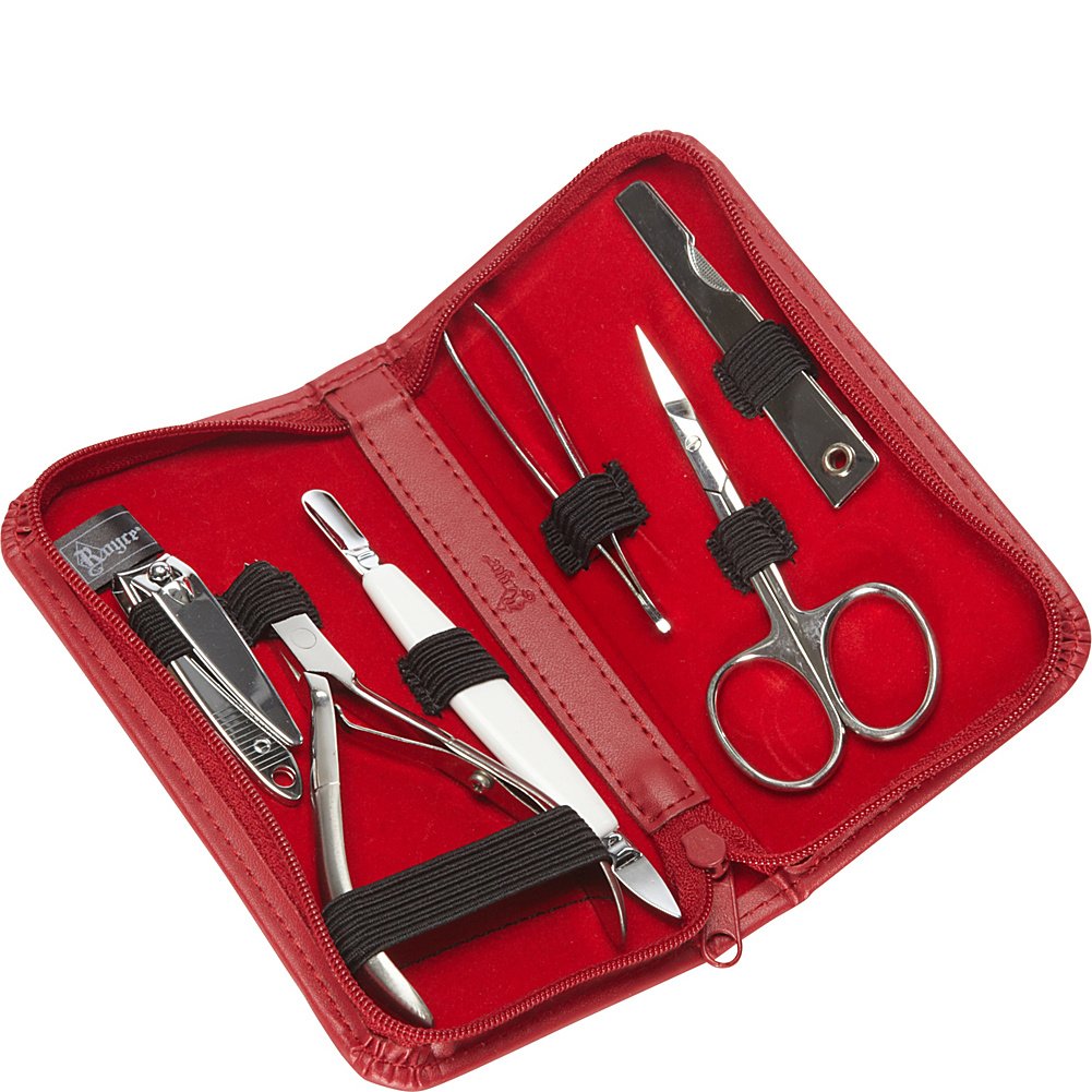 Includes finger nail clipper, nipper, cuticle pusher, folding nail file, tweezers and cuticle scissors.