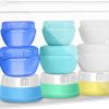 7 inches Color: blue, white, green and yellow Material: food grade silicone & PP Selizo travel bottles containers Sets of 9pcs silicone and PP cream jars is the must have for all kind of travel and trip.
