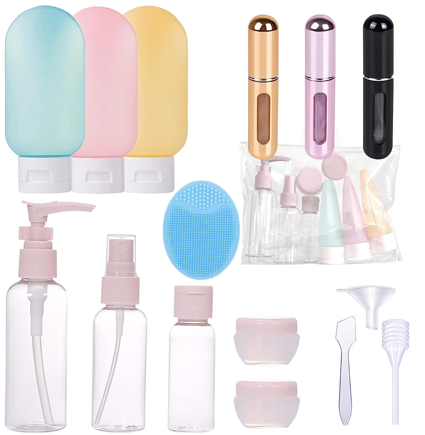 DESIGNED FOR TRAVEL ON THE GO Food Grade Silicone The airplane travel essentials toiletry containers and perfume refillable bottles set made of BPA free and non toxic material, thick and durable, perfect for perfume, lotion, creams, makeup remover, face cleansing, cosmetics, shampoo, conditioner, shower gel, mouthwash, liquid detergent, hand wash etc Portable and Lightweight The travel bottles are packed in a handy PVC bag, easy to take on the go and save your toiletry space, Perfect for travel, outgoing, vacation, plane business trip and camping, Wide opening for easy filling thicker fluids and easily fit a brush to clean the inside of the tube Travel Size Bottle for Portability Easy to Squeeze Soft Silicone Tube Leakproof bottle for protect your gear Wide opening for filling and cleaning Perfume Bottle Using Tips: 1.