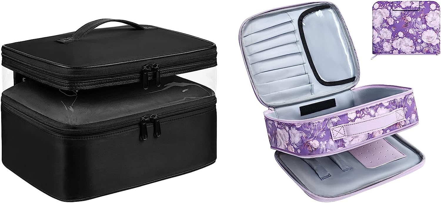 • Adjustable Compartments As NeededThe travel makeup case with adjustable dividers, can adjust the divider to fit the cosmetics. The cosmetic bag has a unique design of double layer for the large palettes or cosmetic tools.A see-through design helps you see what is stored inside clearly and quickly pass the security check.