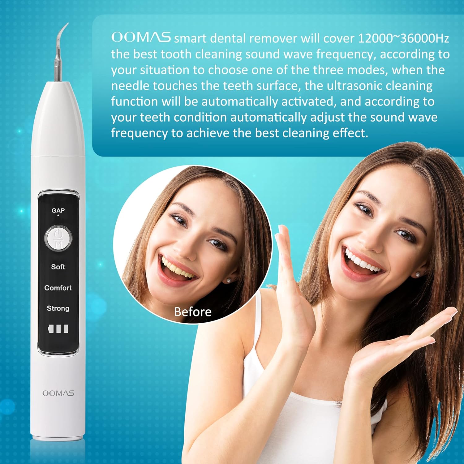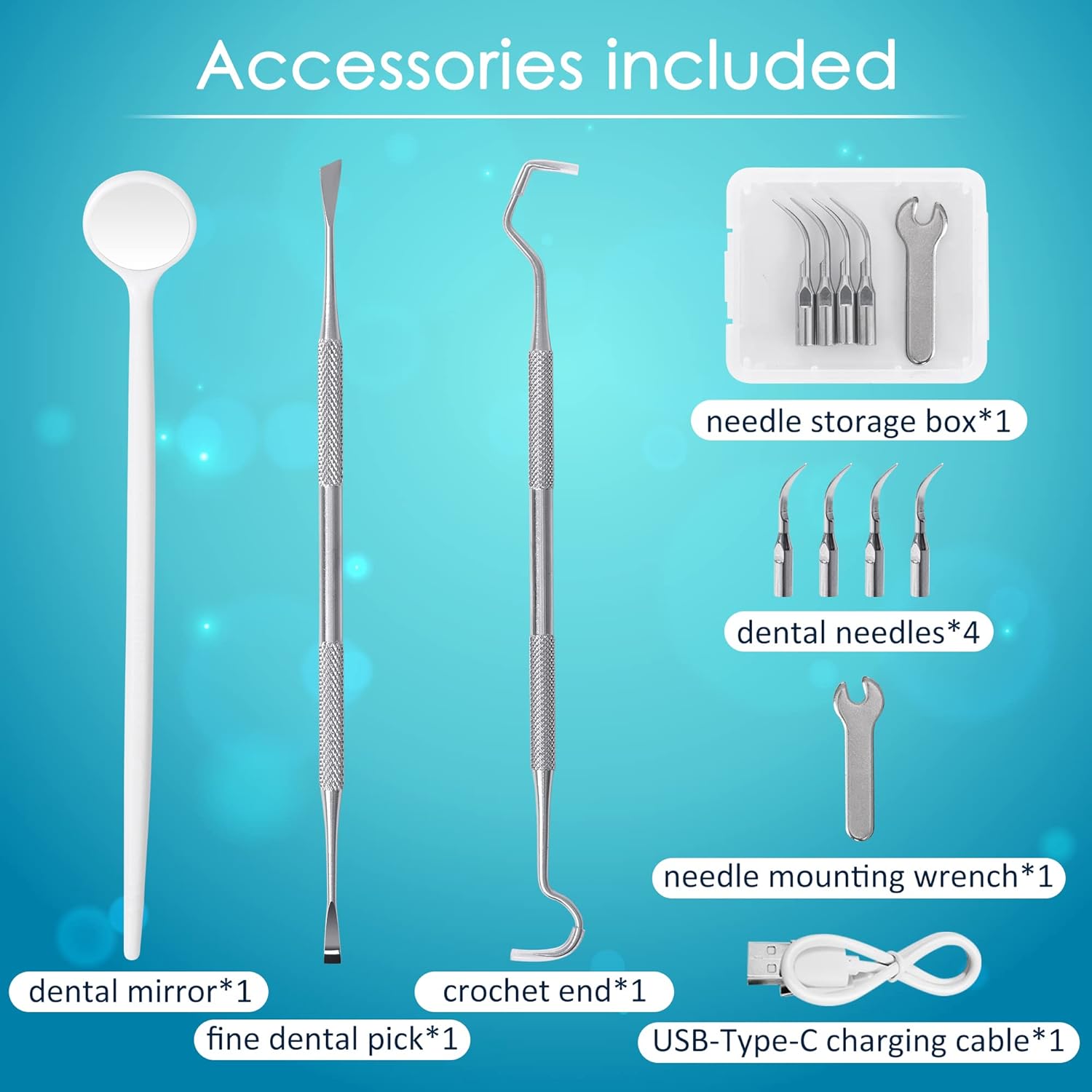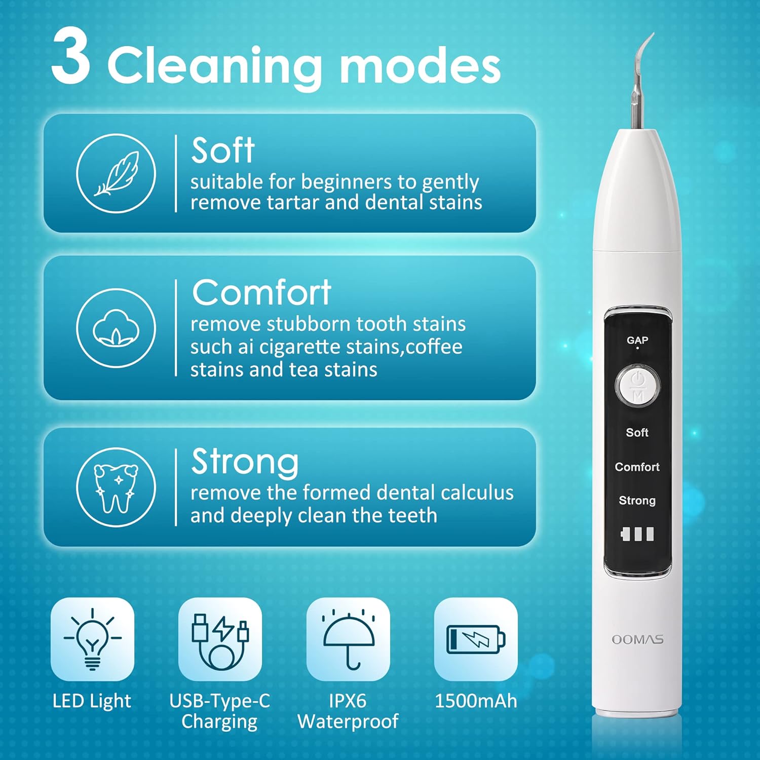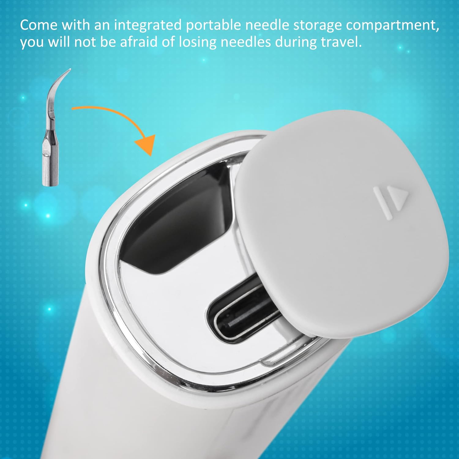 4 Use Steps – Step 1 : Install the cleaning needle on the host with the spanner and tighten the fixing; Step 2 : Long press to start up, and the default is gap neutral mode; Step 3 : Briefly press the switch / mode key to switch to the required mode, gently touch the teeth with the cleaning needle, and move back and forth to clean the tartar or dental calculus.