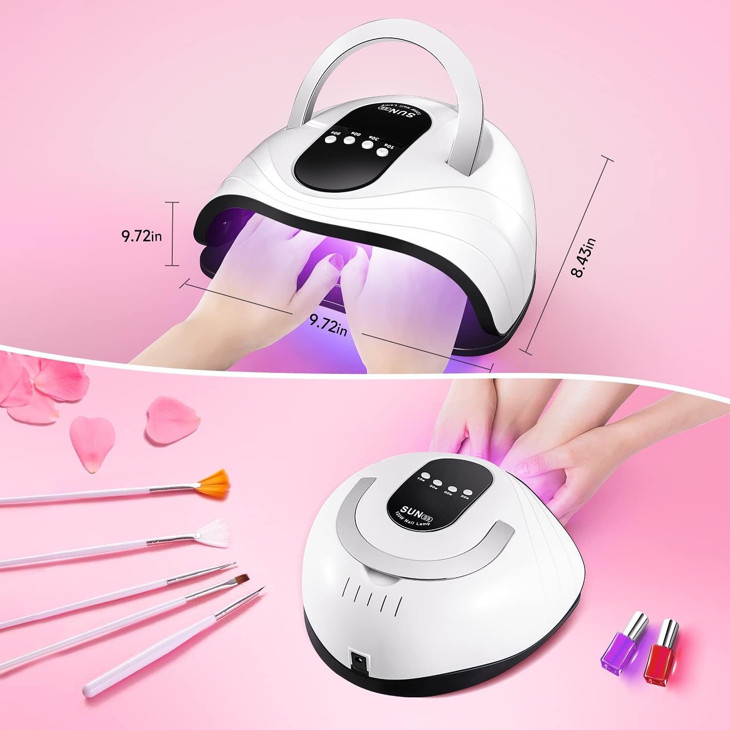 - Two Hands Space & Take Anywhere: Don’t have time to wait for the nails to dry one by one? How about all fingernails or toenails drying together into the UV light for nails? User-friendly larger space design – UV light for nails can save a lot of time for you based on that the gel polish won’t be ruined but No-Dead zone. And you can take a UV led nail lamp anywhere with its portable handle and temperature protection function.