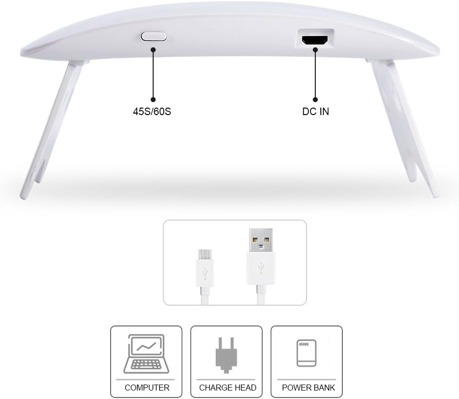 Specification: Item Type: Nail Dryer Material: ABS Optional Colors: Pink, White Voltage: 5 V Power: 6 W Wave Length: 365 + 406 nnm Timing: 45S (Press Switch), 60S (Long Press Switch) LED Quantity: 6Pcs Size: 131 x 67 x 19 mm Package List: 1x Main Body 1 x Instructions 1 x USB Line