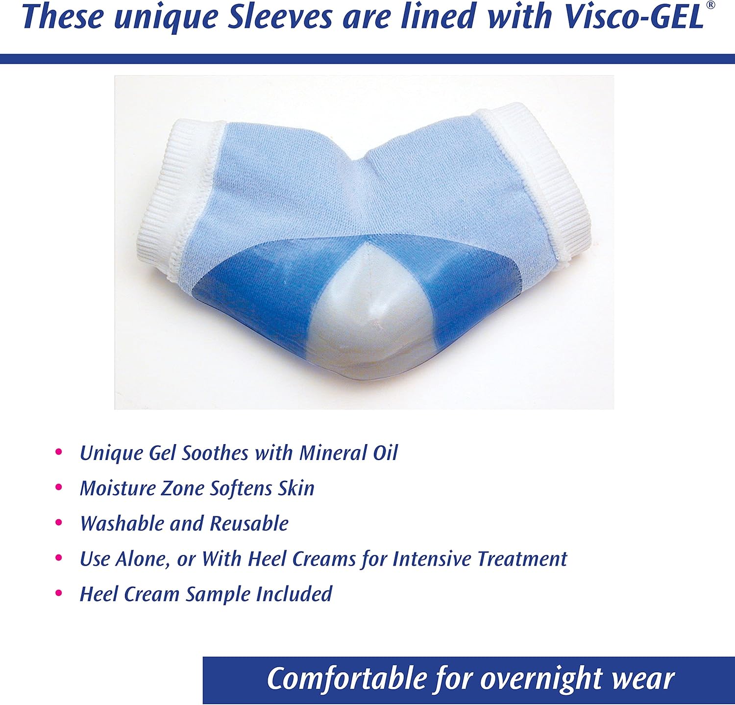 These unique Sleeves are lined with Visco-GEL® that releases vitamin E-enriched mineral oil onto the skin surface to help soften and moisturize rough, dry, cracked heels.