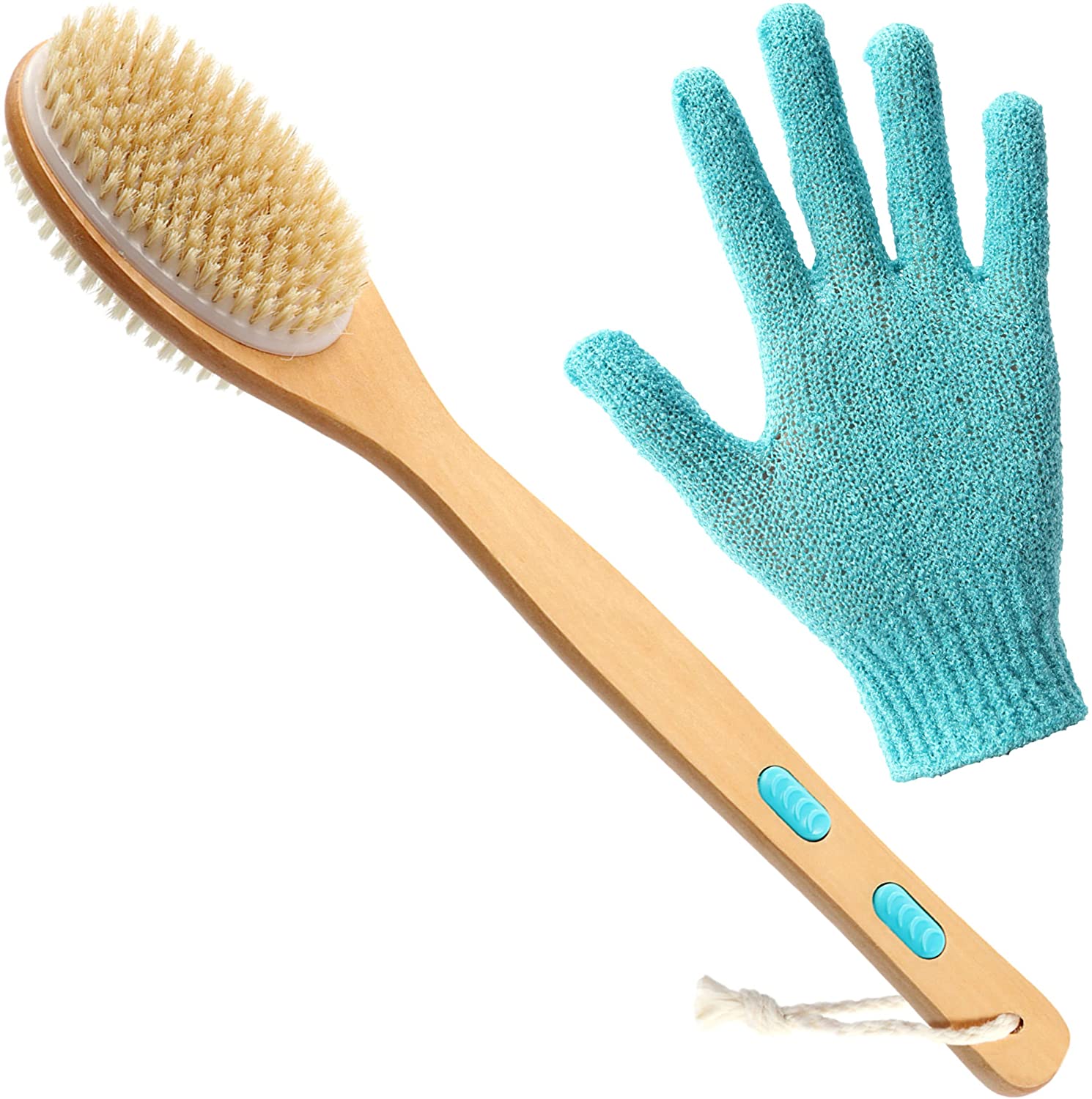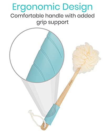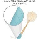 LONG EXTENDED REACH HANDLE: Constructed with a durable lotus wood, the wooden handle is over 17” long. The extended handle allows you to clean hard to reach areas such as the back and the feet with ease. Additionally, a textured rubber sleeve provides a comfortable, yet secure, nonslip grip even when wet.
