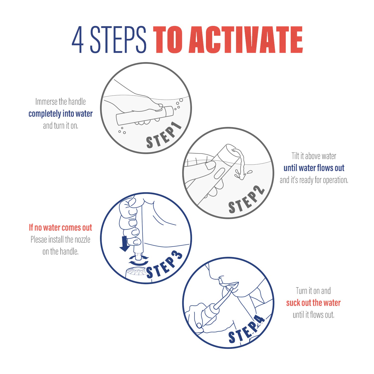 How To Activate①Immerse the water flosser handle totally into water and turn it on.②Tilt the handle above water until there’s water flowing out from the nozzle hole. This indicates the handle is activated successfully.③Install the nozzle on it for use.If no water comes out a few seconds later, please install the nozzle on the handle and then place the nozzle tip in your mouth. Turn on the teeth irrigator and suck out the water by your mouth until it flows out successfully.