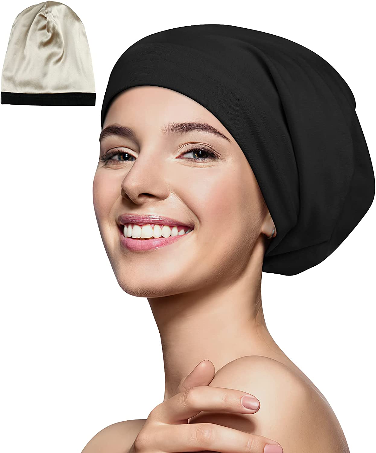 DESIGNED FOR ALL TYPES OF HAIRSilk satin lined sleep caps was created for all types and length of hair:Dreadlocks,Long Braids,Frizzy,Flyaway,Straight.Soft satin helps retain the moisture in your hair, eliminates breakage while sleeping. Keeps your hairstyle fresh and frizz free. Prevents tangles, breakage, and dry damaged hair during sleep
