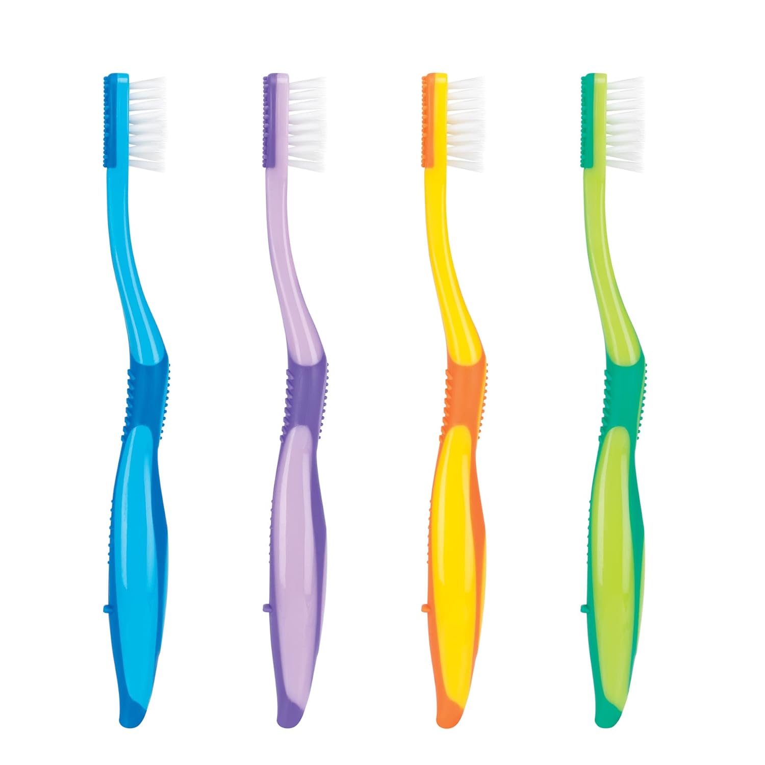 22 tufts of extended-reach, cross-angle, fine-tipped bristles Built-in tongue cleaner Packaged in blister packs.
