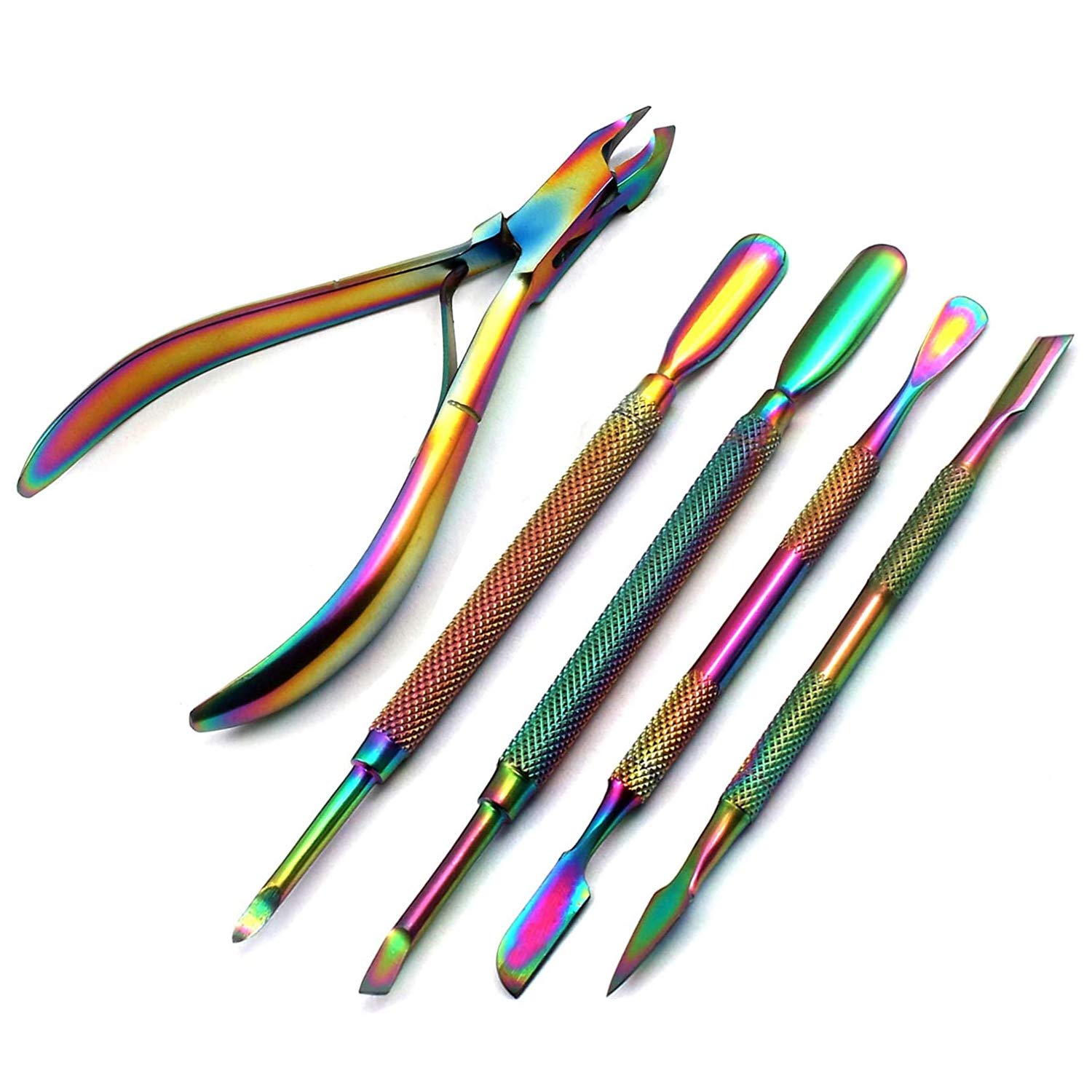 : CUTICLE PUSHER REMOVER WITH NIPPER RAINBOW STAINLESS STEEL MANICURE NAIL ART TOOL SET